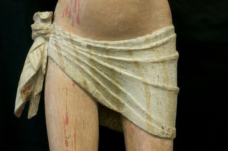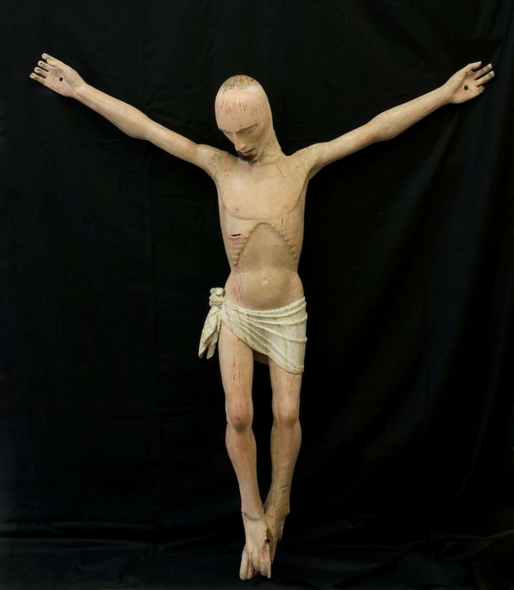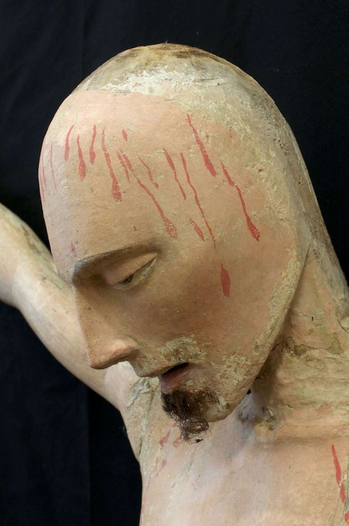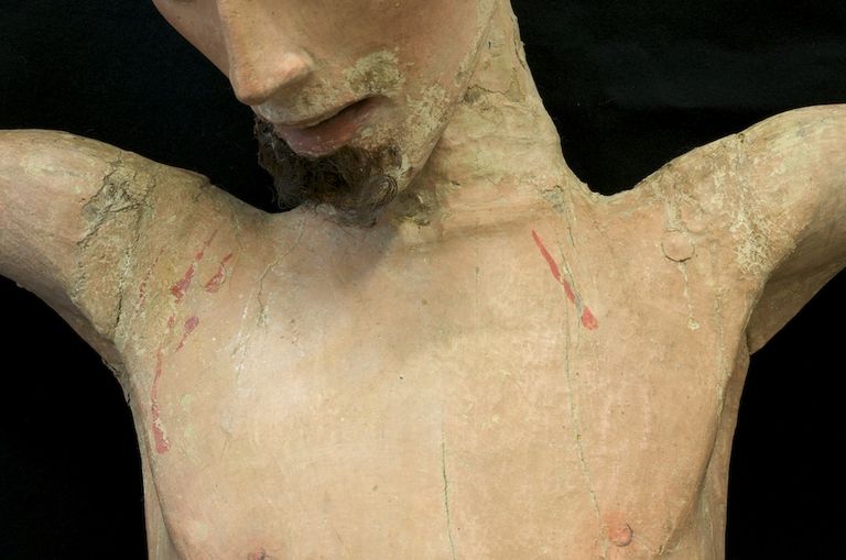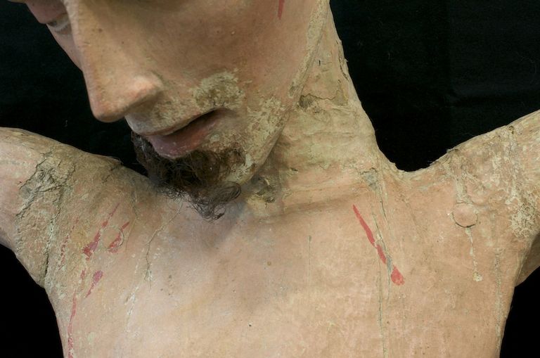 In volta effettuate le analisi stratigrafiche e accertato che la ridipintura era unica si è proceduto alla messa a punto di un solvent-gel a base di acetone per rimuovere lo spesso strato di gesso e colore che dcopriva l'intera opera. Per fare questo si è proceduto all'apertura di tasselli in varie zone del corpo per verificare l'integrità e I' uniformità della policromia originale e individuare in modo scientifico la metodologia d'intervento. Finiti i saggi preliminari che hanno chiarito come le parti originali sulla parte frontale fossero recuperabili, si è proceduto alla messa a punto del tempo di impacco del solvent-gel e alla rimozione del gesso con bisturi ed occhiali con lenti d'ingrandimento per non danneggiare roriginale e tenere sotto controllo la pulitura eseguita con molta cautela. Per prima cosa si è proceduto ìIla rimozione della ridipintura di metà busto scoprendone la cromia in un buono stato : ma non sono mancate le sorprese. Il capezzolo del Crocifisso era finemente dipinto in maniera molto realistica con il dettaglio di una leggera peluria che lo decorava eseguita in punta di pennello, inoltre dalla ferita del costato era visibile e ben conservato il sanguinamento originale che era stato occultato dalla ridipintura. Ilcostato si è mostrato ben definito con una serie di velature di colore che ne esaltavano il modellato ,Proseguendo nella lenta pulitura anche sulla gamba destra la cromia originale era ben conservata e soprattutto sono apparsi sanguinamenti che forse per un cambiamento di gusto erano stati celati nel vecchio intervento. Rimosso l'intervento precedente di tutto il corpo si è proceduto alla pulitura del volto: occhi allungati semiaperti con finissime ciglia e pupilla dipinta di azzurro e nero resa con grande maestria, sopracciglia leggermente arcuate nere zigomi realistici con le guance leggermente arrossate. Sulla fronte sono risultati evidenti i sanguinamenti originali più abbondanti e sul mento le tracce di barba e baffi andati quasi completamente perduti. La nuca completamente glabra addirittura senza traccia di colore portava anch'essa i segni di colle animali che sostenevano i capelli. II perizoma aveva all'interno del fiocco lacerti di colore rosso e verde mentre sul fronte è stata ritrovata una policromia che riprendeva un tessuto bianco a righe gialle ( orpimento) mentre nel retro è stato ritrovato un lacerto dorato bulinato e laccato di rosso e verde, molto prezioso. Con una certa probabilità il Cristo aveva un perizoma decorato diversamente in tempi antichi è stato completamente rimosso il colore sul davanti e rifatto, bianco a righe gialle come lo vediamo noi ora. ll lacerto che è stato scoperto nel retro apparteneva al perizoma originale. Per precisione le indagine stratigrafiche avevano prelevato un campione nella parte anteriore del perizoma ma non avevano evidenziato alcuna traccia di altra policromia evidentemente era stata rimossa completamente in un antico intervento.