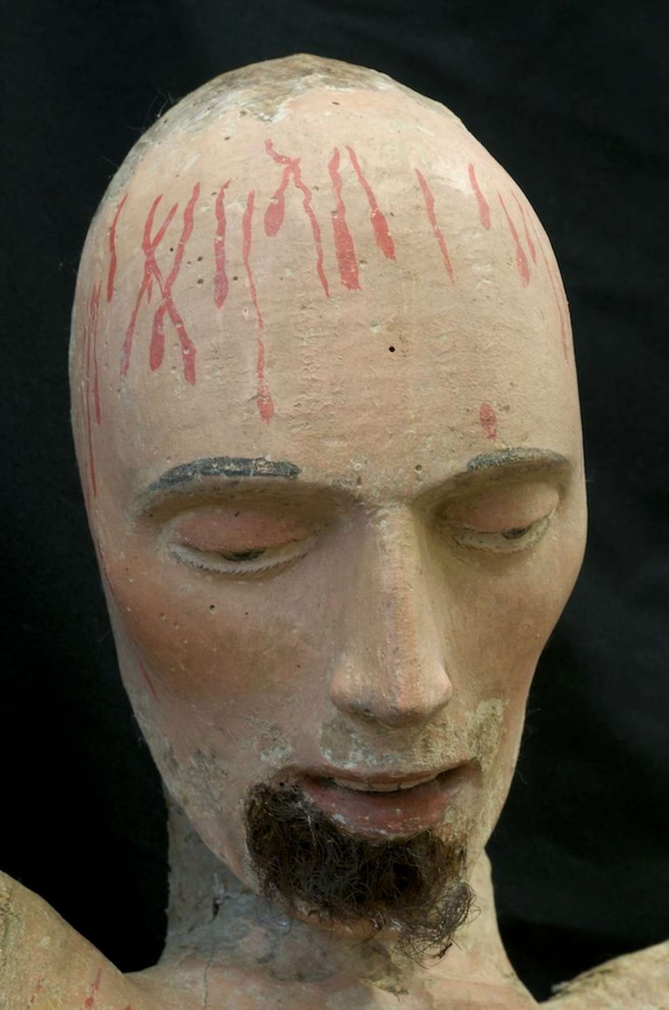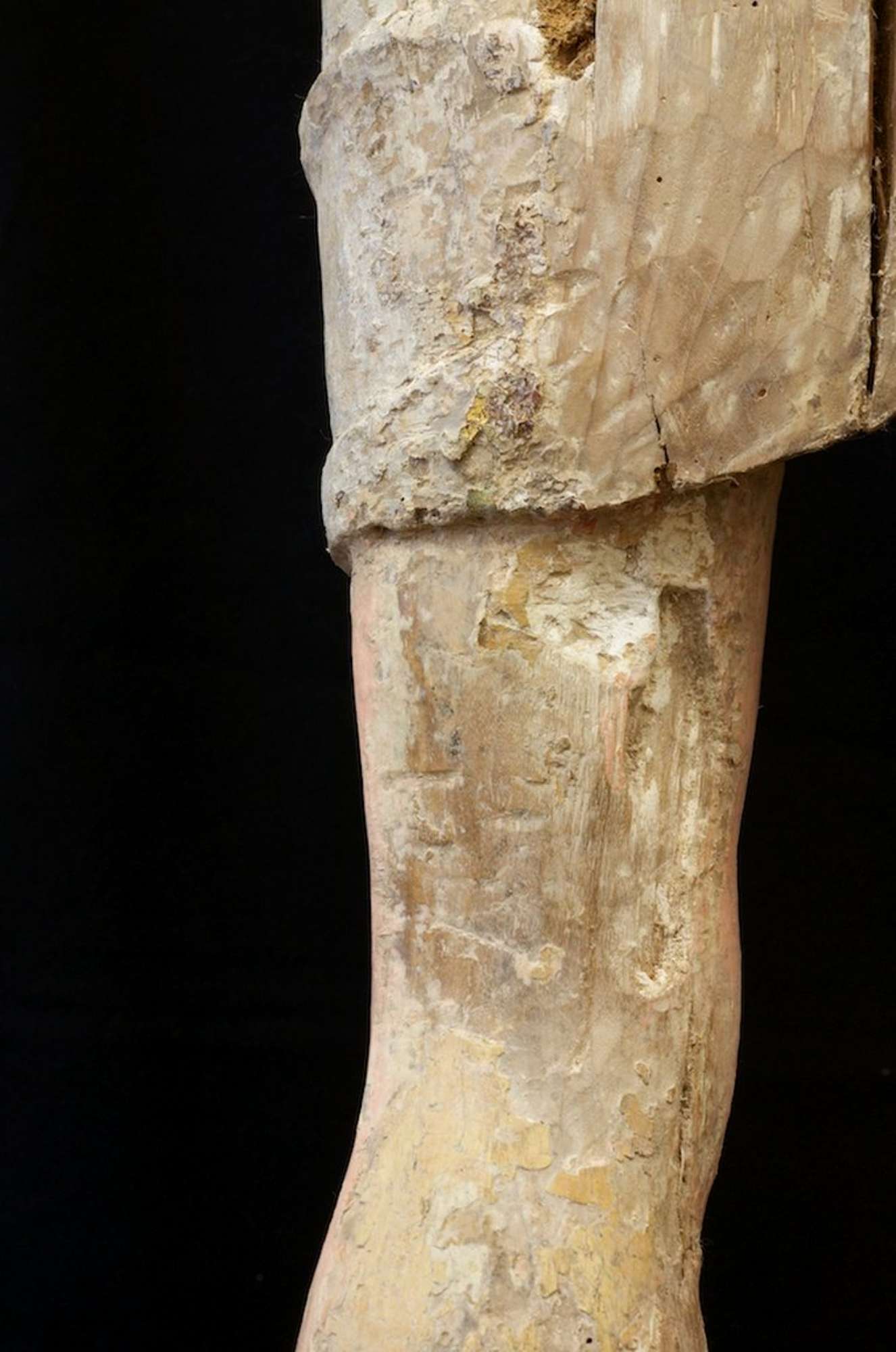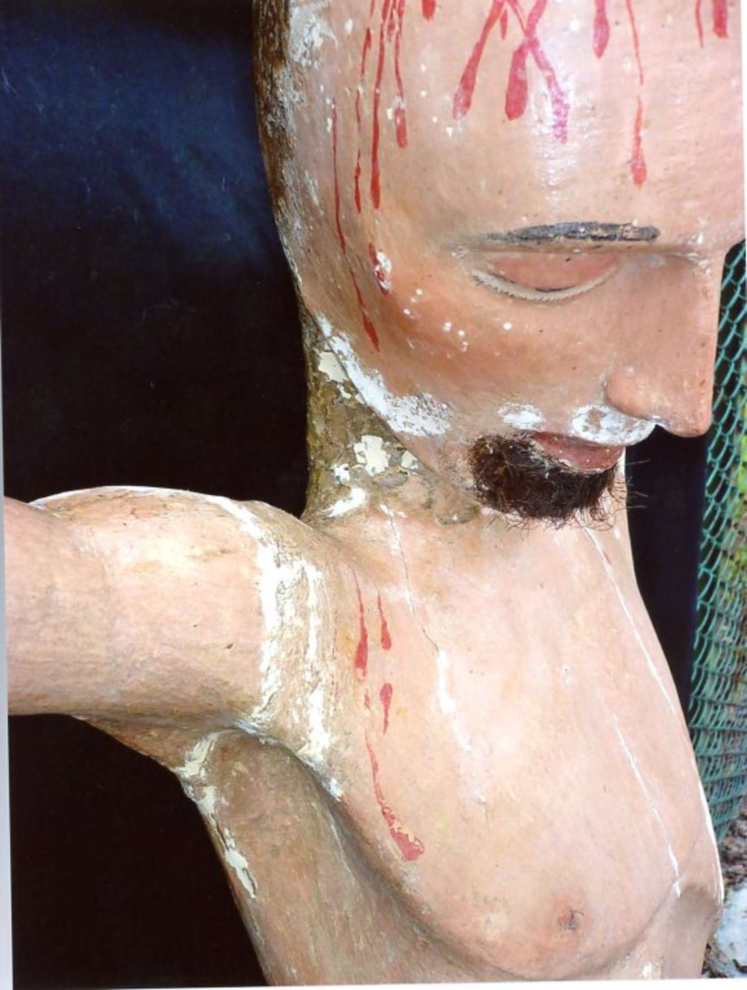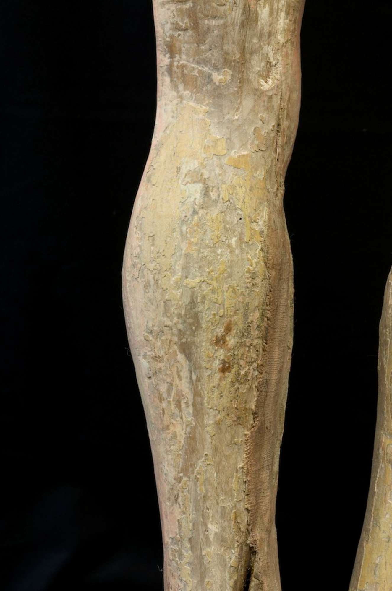 In volta effettuate le analisi stratigrafiche e accertato che la ridipintura era unica si è proceduto alla messa a punto di un solvent-gel a base di acetone per rimuovere lo spesso strato di gesso e colore che dcopriva l'intera opera. Per fare questo si è proceduto all'apertura di tasselli in varie zone del corpo per verificare l'integrità e I' uniformità della policromia originale e individuare in modo scientifico la metodologia d'intervento. Finiti i saggi preliminari che hanno chiarito come le parti originali sulla parte frontale fossero recuperabili, si è proceduto alla messa a punto del tempo di impacco del solvent-gel e alla rimozione del gesso con bisturi ed occhiali con lenti d'ingrandimento per non danneggiare roriginale e tenere sotto controllo la pulitura eseguita con molta cautela. Per prima cosa si è proceduto ìIla rimozione della ridipintura di metà busto scoprendone la cromia in un buono stato : ma non sono mancate le sorprese. Il capezzolo del Crocifisso era finemente dipinto in maniera molto realistica con il dettaglio di una leggera peluria che lo decorava eseguita in punta di pennello, inoltre dalla ferita del costato era visibile e ben conservato il sanguinamento originale che era stato occultato dalla ridipintura. Ilcostato si è mostrato ben definito con una serie di velature di colore che ne esaltavano il modellato ,Proseguendo nella lenta pulitura anche sulla gamba destra la cromia originale era ben conservata e soprattutto sono apparsi sanguinamenti che forse per un cambiamento di gusto erano stati celati nel vecchio intervento. Rimosso l'intervento precedente di tutto il corpo si è proceduto alla pulitura del volto: occhi allungati semiaperti con finissime ciglia e pupilla dipinta di azzurro e nero resa con grande maestria, sopracciglia leggermente arcuate nere zigomi realistici con le guance leggermente arrossate. Sulla fronte sono risultati evidenti i sanguinamenti originali più abbondanti e sul mento le tracce di barba e baffi andati quasi completamente perduti. La nuca completamente glabra addirittura senza traccia di colore portava anch'essa i segni di colle animali che sostenevano i capelli. II perizoma aveva all'interno del fiocco lacerti di colore rosso e verde mentre sul fronte è stata ritrovata una policromia che riprendeva un tessuto bianco a righe gialle ( orpimento) mentre nel retro è stato ritrovato un lacerto dorato bulinato e laccato di rosso e verde, molto prezioso. Con una certa probabilità il Cristo aveva un perizoma decorato diversamente in tempi antichi è stato completamente rimosso il colore sul davanti e rifatto, bianco a righe gialle come lo vediamo noi ora. ll lacerto che è stato scoperto nel retro apparteneva al perizoma originale. Per precisione le indagine stratigrafiche avevano prelevato un campione nella parte anteriore del perizoma ma non avevano evidenziato alcuna traccia di altra policromia evidentemente era stata rimossa completamente in un antico intervento.