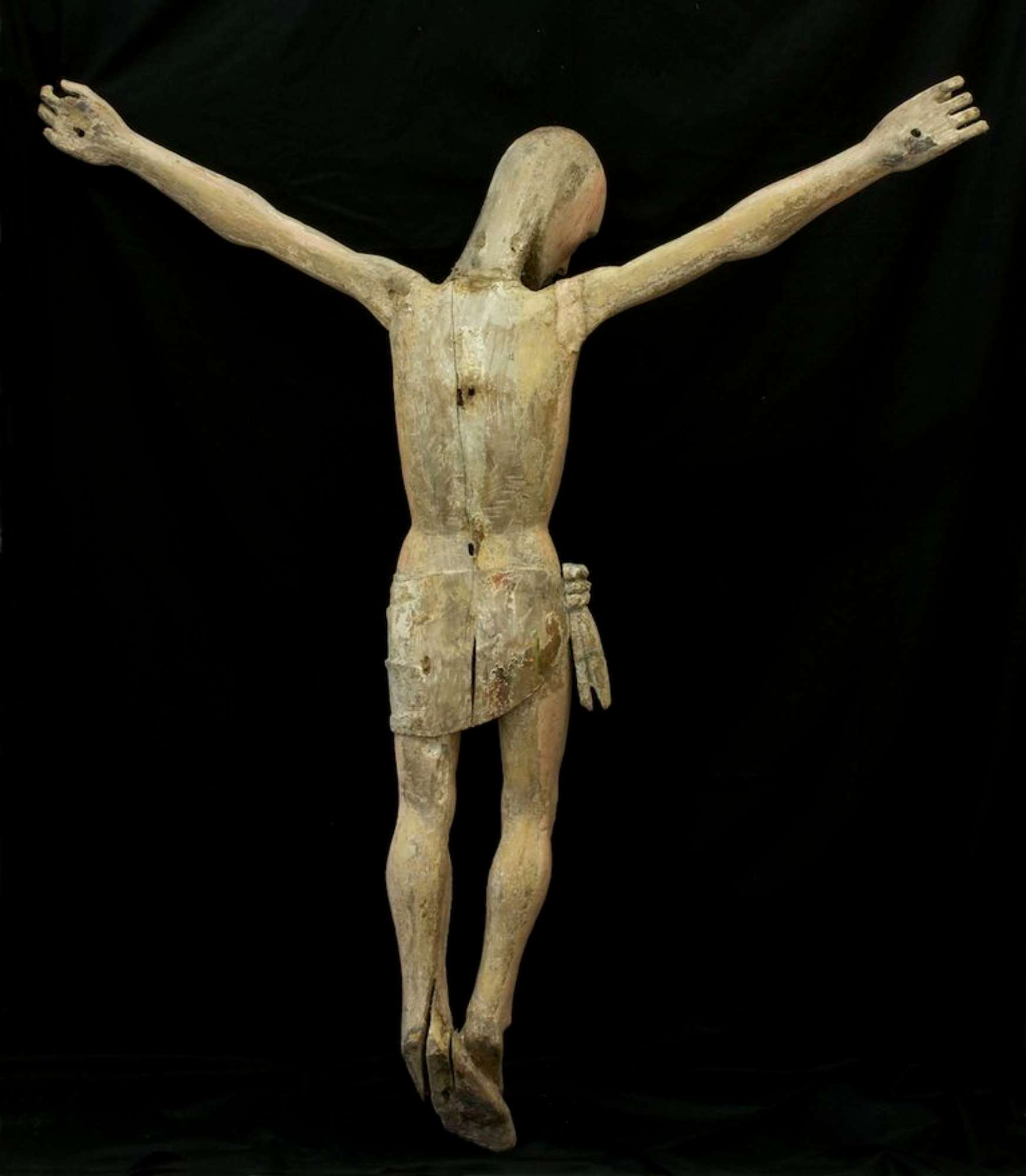 II corpo del Cristo si presentava in cattivo stato di conservazione e appariva totalmente ridipinto nell'800 con uno spesso strato di gesso e colore grigiorosa che aveva drasticamente travisato l'aspetto originale. Le braccia fissate al busto con perni di legno ben visibili, erano fessurate e sormontate da bende di lino originali per dare più consistenza e robustezza all'insieme. Le mani erano mancanti di parti di falangi: quattro nella destra e due nella sinistra. I piedi sormontati uno all'altro presentavano una spaccatura profonda del legno nel retro e risultava totalmente mancante l'alluce del piede destro. La testa del Cristo così come le braccia era fissata all'altezza del collo al busto con perni di legno ed avvolta da bende di lino per conferirgli maggiore robustezza. Una volta smontata dalla croce la scultura si è potuto verificare come il retro avesse un diverso stato di conservazione, ancora più danneggiato e con ridipinture grossolane a gesso e tempera rosa ; ma soprattutto era evidente come la policromia originale fosse andata quasi irrimediabilmente perduta . In base alle prime osservazioni visive si è ipotizzato che il Cristo fosse in origine montato su di una Croce diversa poi rimasta molto danneggiata a causa di una collocazione malsana nell'arco dei secoli ( muri umidi, attacco di insetti Xilofagi,muffe) quindi sostituita con quella baie, e che la policromia del retro del nostro crocifisso ne abbia inevitabilmente sofferto perdendo