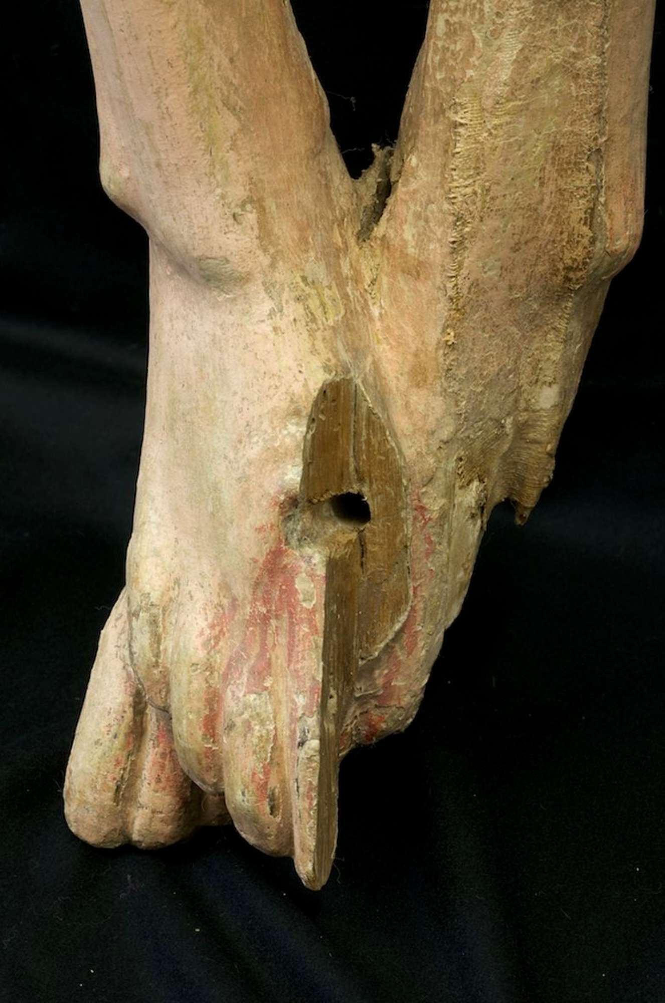 capacità di ancoraggio. Sono state fatte delle iniezioni localizzate nelle fessurazioni con colla forte ammale, per rendere ancora resistenti le vecchie tele facendone penetrare anche nel legno dove atcessario. In accordo con la Direzione lavori si è pensato di ricostruire le falangi mancanti di entrambe kmani (quattro nella destra e due nella sinistra)e l'alluce del piede destro con una resina per restauro compatibile con i movimenti del legno,I'araldite b 72. Tutte le lacune sono state stuccate a livello con gesso di Bologna e colla animale, il restauro pittorico nel fronte è stato eseguito con velature di colore a vernice che non ossida nel tempo, e con un risultato di tipo mimetico. Nel retro le stuccature e le grandi fessurazioni sono state chiuse a cera d'api naturale e quello che rimaneva della preparazione è stata consolidata ma non ritoccata poiché la superficie originale perduta era troppo estesa .Infine è stata fatta la disinfestazione dai tarli con Permatar in ambiente sottovuoto.