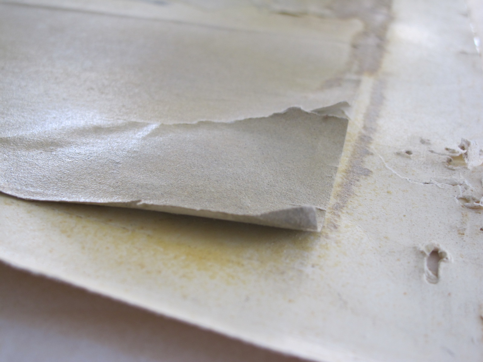 -Rimozione (recto/verso) a bisturi di tutti i residui di ruggine lasciati dagli elementi metallici sulla carta