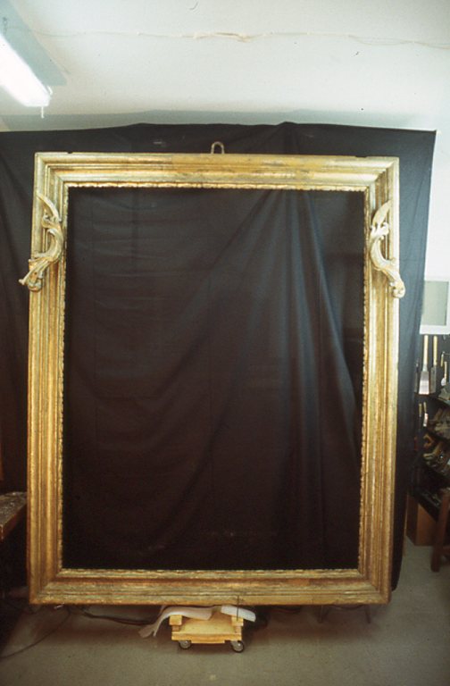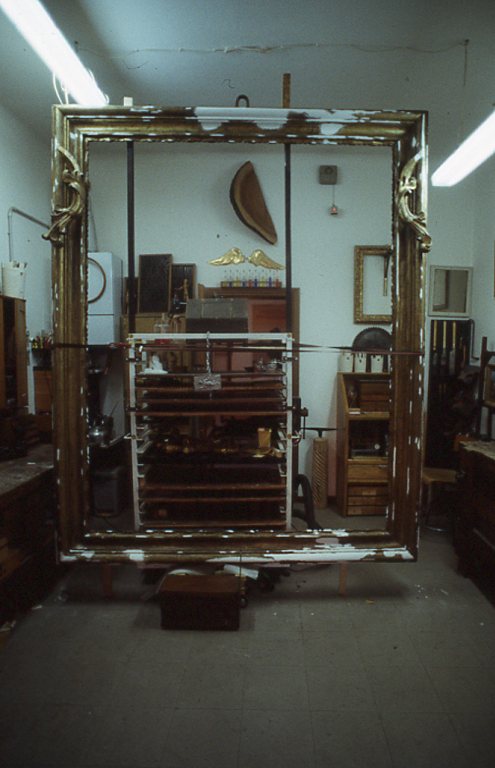 La struttura in legno presentava spaccature e lacune sul retro negli incastri di giunzione,mancavano particolari dell'intaglio ornamentale,la superficie argentata presentava numerose decoesioni e lacune.