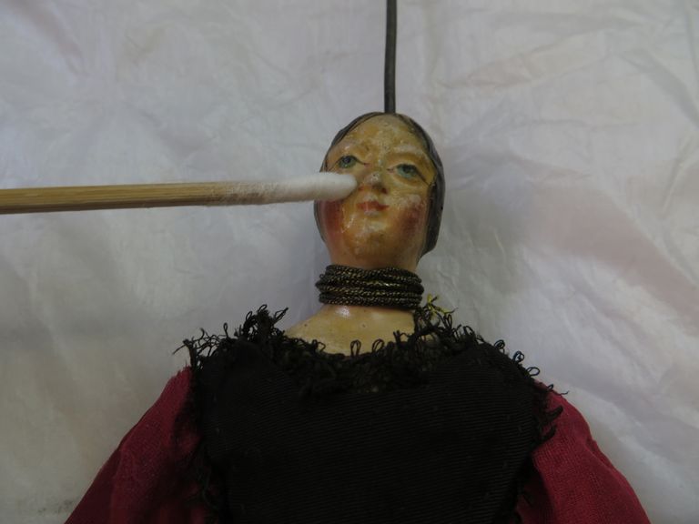 Nella maggior parte dei casi il capo delle marionette presentava numerosi punti di rottura in corrispondenza delle giunture della testa, del collo, delle spalle e del foro di passaggio del filo di ferro. Gli inserti in carta impiegati per le rifiniture risultavano parzialmente distaccati dal vestito, lacerati e lacunosi.
