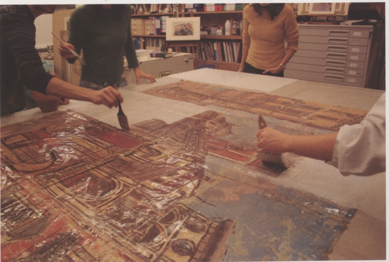 Per poter procedere alla spianatura dell'opera è stato necessario supportarla interamente, ciò che ha reso necessario rimuovere a maggior parte delle toppe presenti. Quando possibile, tali toppe che, come già accennato, costituiscono una preziosa testimonianza sono state ricollocate sul verso del manufatto , le toppe che è stato possibile non togliere so no state rese visibili grazie a delle finestre realizzate sul supporto applicato. L'intervento per via umida è stato preceduto dal fissaggio della pellicola pittorica, che presentava sia problemi di adesione sia di coesione. Non è stato effettuato un montaggio finale dell'opera su un supporto rigido poiché i fondali, per loro natura, devono essere fogli liberi.