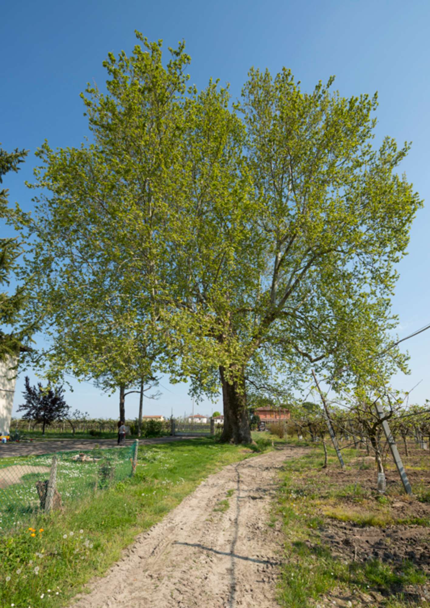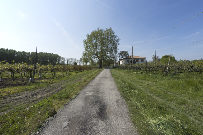 via Emilia, in un tipico paesaggio agricolo della pianura romagnola, caratterizzato da colture estensive e frutteti. Segna l’accesso alla corte con la sua