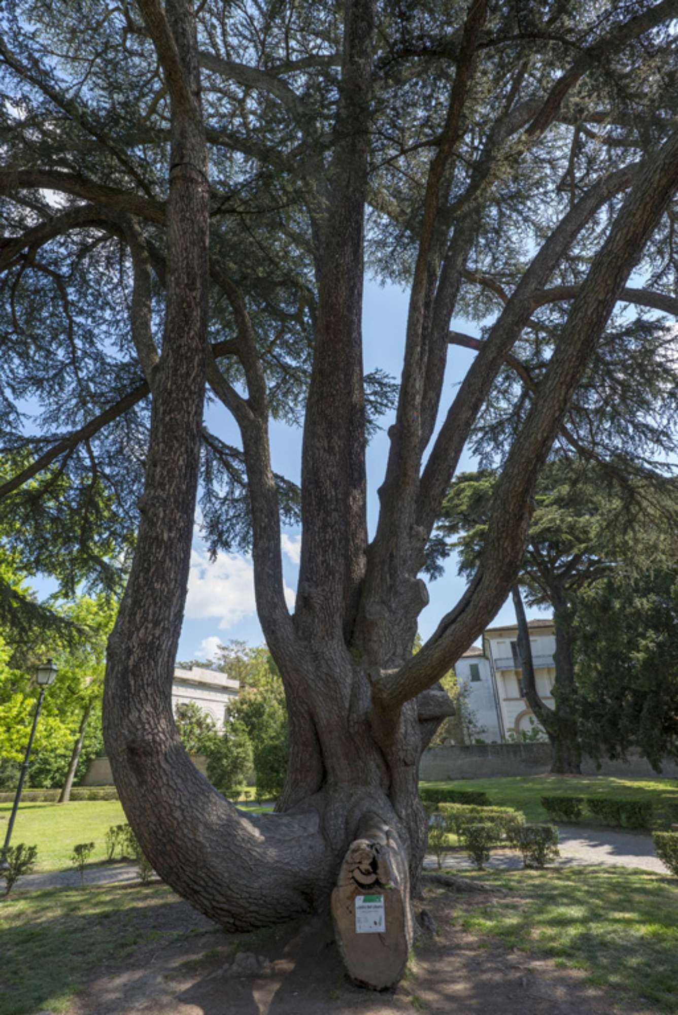 Il cedro compagno posto a sinistra dell’ingresso, anch’esso grandissimo, è fortemente inclinato e incombe sulla strada; viene sostenuto da robusti tiranti e da una complessa impalcatura; grazie all’accorato intervento di un cittadino paladino degli alberi durante l’ultima guerra è fortunatamente sopravvissuto ad un abbattimento già programmato da un comando tedesco per farne legna da ardere.