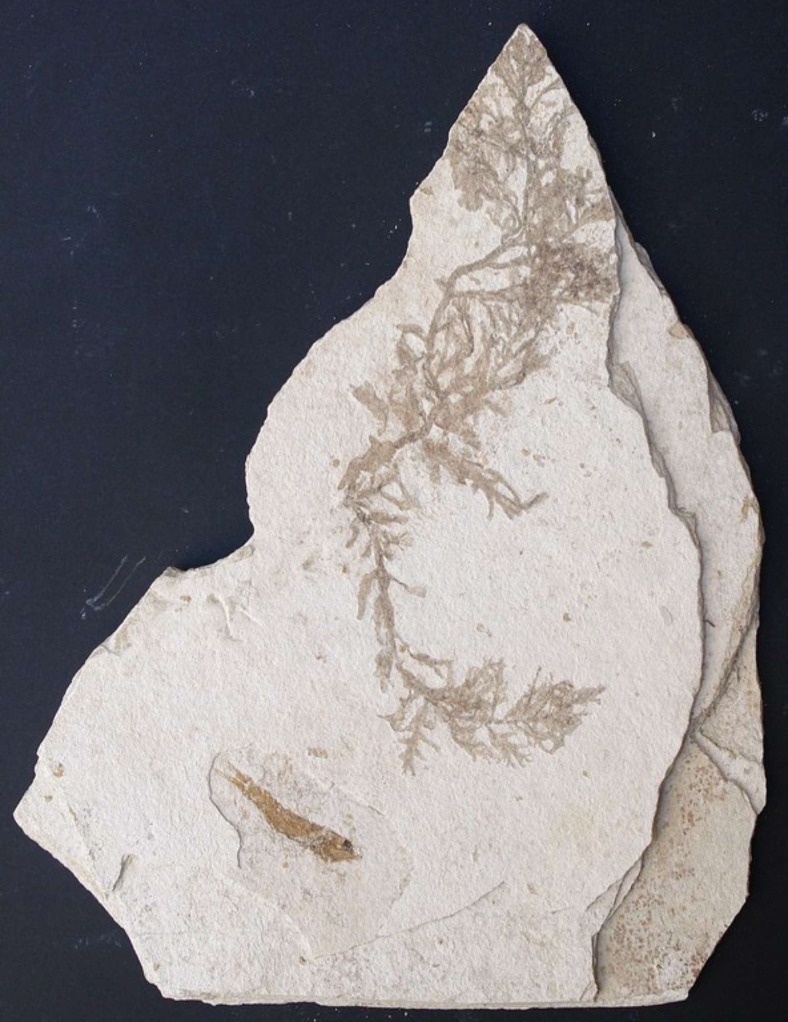 Resto di alga all'intero della formazione del Tripoli (sedimento biancastro, farinoso, finemente stratificato). Il fossile è costituito da da due esemplari: un'alga e un pesce lanterna (Diaphus).