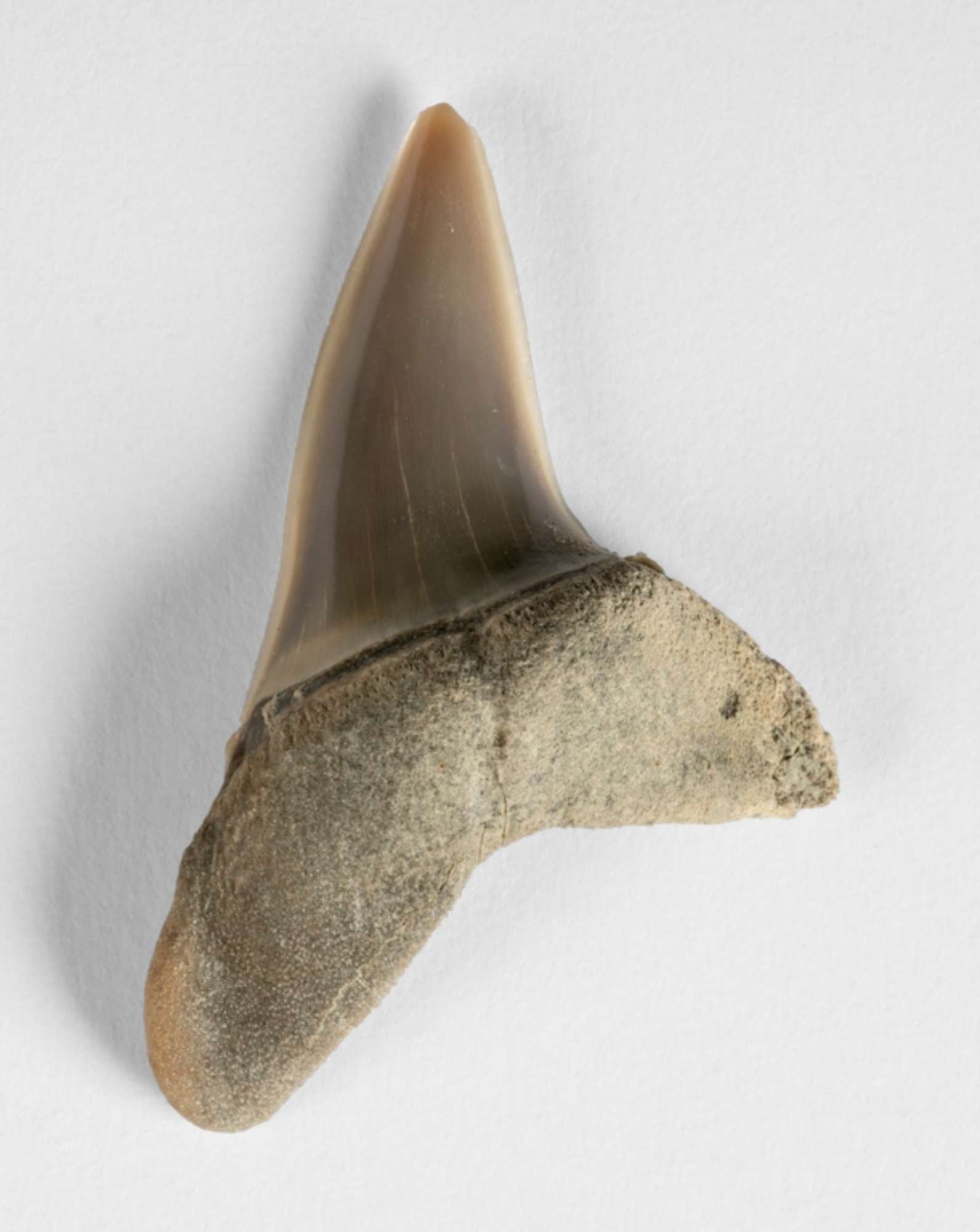 dente antero-laterale superiore completo di radice e con apice cuspide lievemente scheggiata