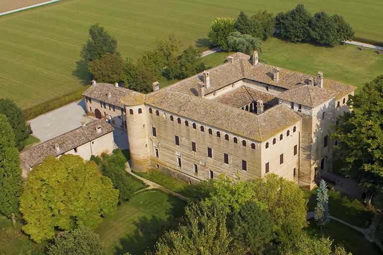 Posto all’estremità nordest del borgo, a cui è collegato da un imponente viale di tigli, il castello a pianta quadrangolare è caratterizzato dal mastio sporgente dal fronte meridionale, ed è chiuso a settentrione da due torrioni tondi.