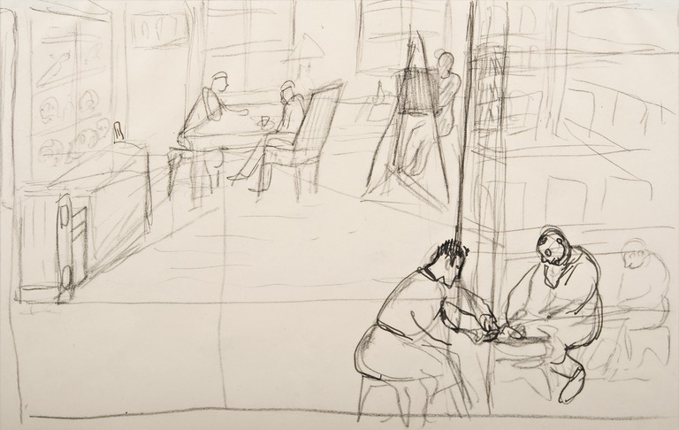 Disegno in prospettiva del laboratorio di patologia di Gusen, con sfondo della stanza soltanto abbozzato. In primo piano, Pawlowski e Malost sono al lavoro su un preparato anatomico. Sullo sfondo, a sinistra, il tavolo dei medici con il dottor Goscinski e un assistente e, dietro, un armadio, in cui erano custoditi dei teschi. Al centro vi è Aldo Carpi che dipinge. Le dimensioni reali del laboratorio erano molto più ridotte di quelle che appaiono nel disegno.