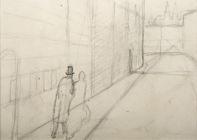 Disegno in prospettiva laterale: in primo piano vi sono le sagome di un uomo e di una donna che camminano su un marciapiede che costeggia un edificio. Le due persone sono rappresentate di spalle. Sono ancora visibili le linee di costruzione della veduta prospettica.