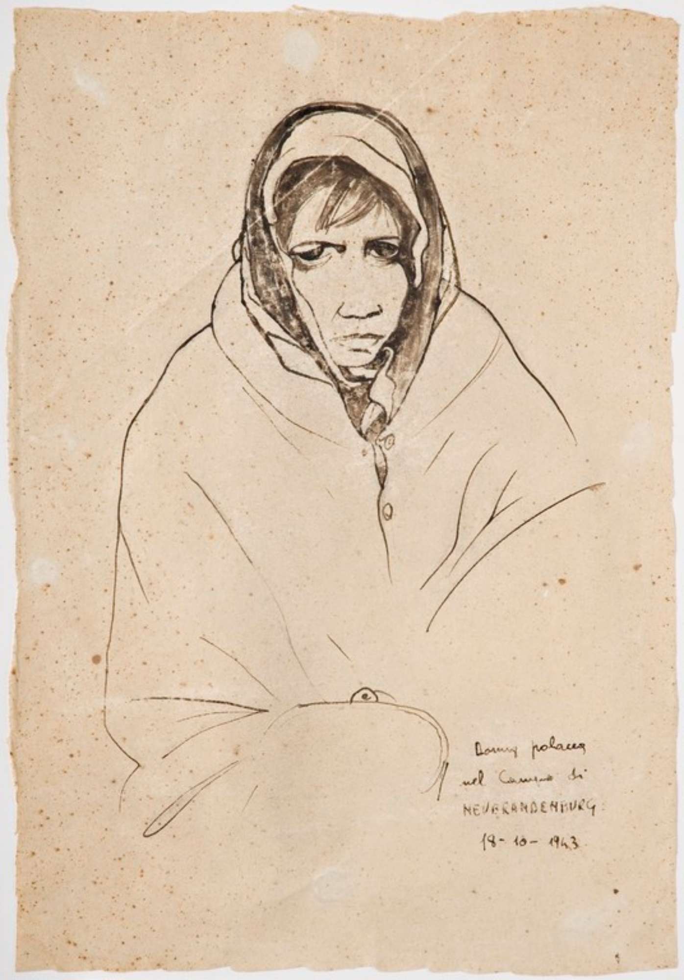 Alberto Cavallari eseguì questo disegno durante la sua prigionia nel campo di Neubrandemburg. In cambio di ritratti agli ufficiali e ai loro familiari, ottenne infatti alcuni pezzi di carta da pacco, dell'inchiostro e qualche penna rudimentale o matita con cui registrò in presa diretta le situazioni di violenza e morte che condivise con i prigionieri dei campi. Si tratta di immagini vive, di cronaca, prive di ogni dimensione consolatoria, in cui l'annullamento della personalità è rappresentato da corpi scheletrici e segni inquieti e dolorosi. Da questa esperienza, Cavallari cominciò a disegnare e, quindi, il suo percorso di artista.