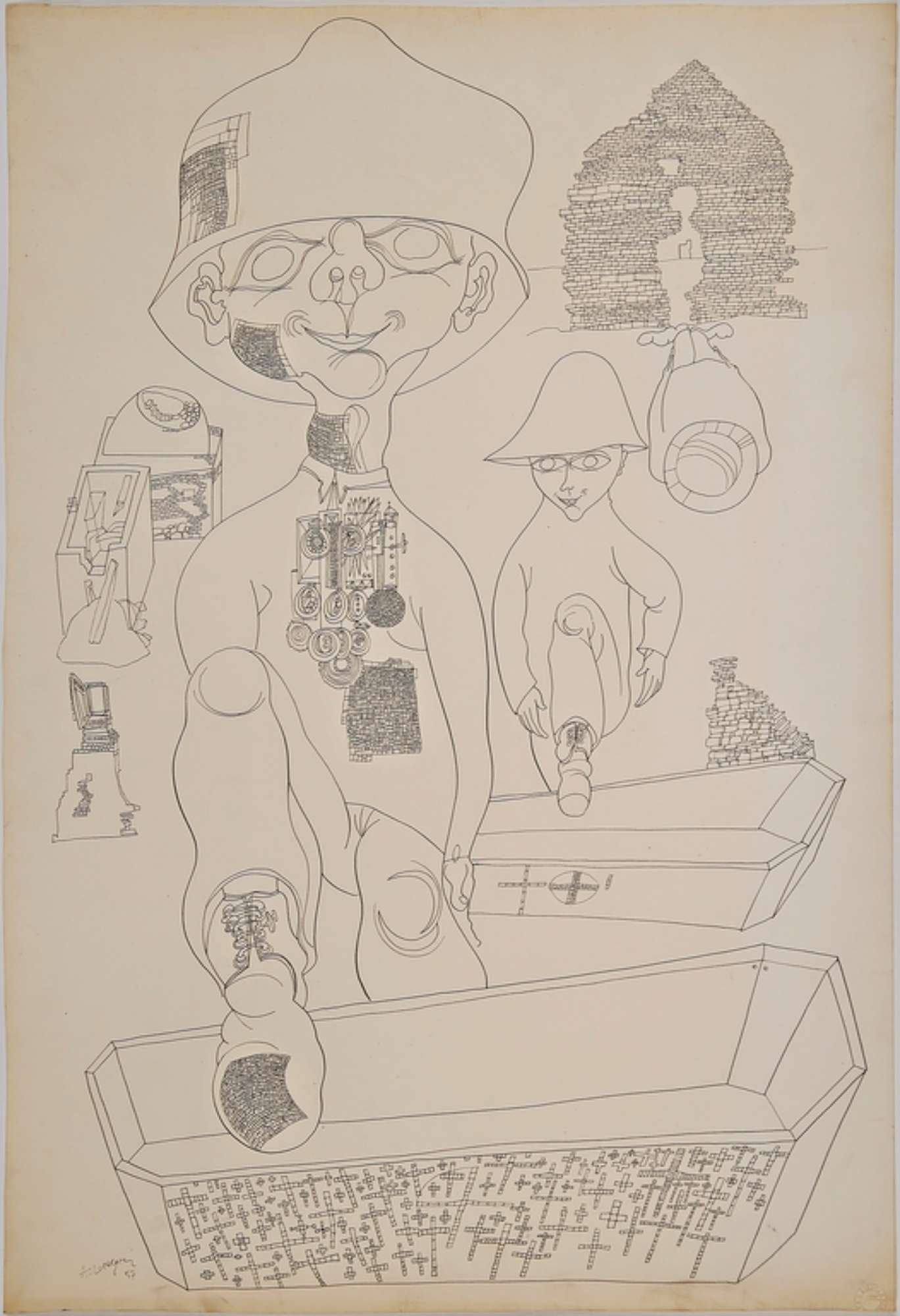 In primo piano, è rappresentato frontalmente un soldato in piedi, con una gamba sollevata nell'atto di entrare in una bara vuota davanti a lui. Il soldato è disegnato in modo quasi caricaturale: i tratti del viso, nascosti sotto un pesante elmetto, sono pieni e vivaci, sul petto sono affastellate medaglie geometriche quasi a ribadirne la vuota importanza nel momento in cui ci si avvicina alla morte, il corpo e gli abiti sono simbolicamente "rammendati" con le stesse toppe. Alle sue spalle, un altro soldato sta subendo la stessa sorte, mentre sullo sfondo un terzo è già caduto, forse fucilato davanti ad un muro.