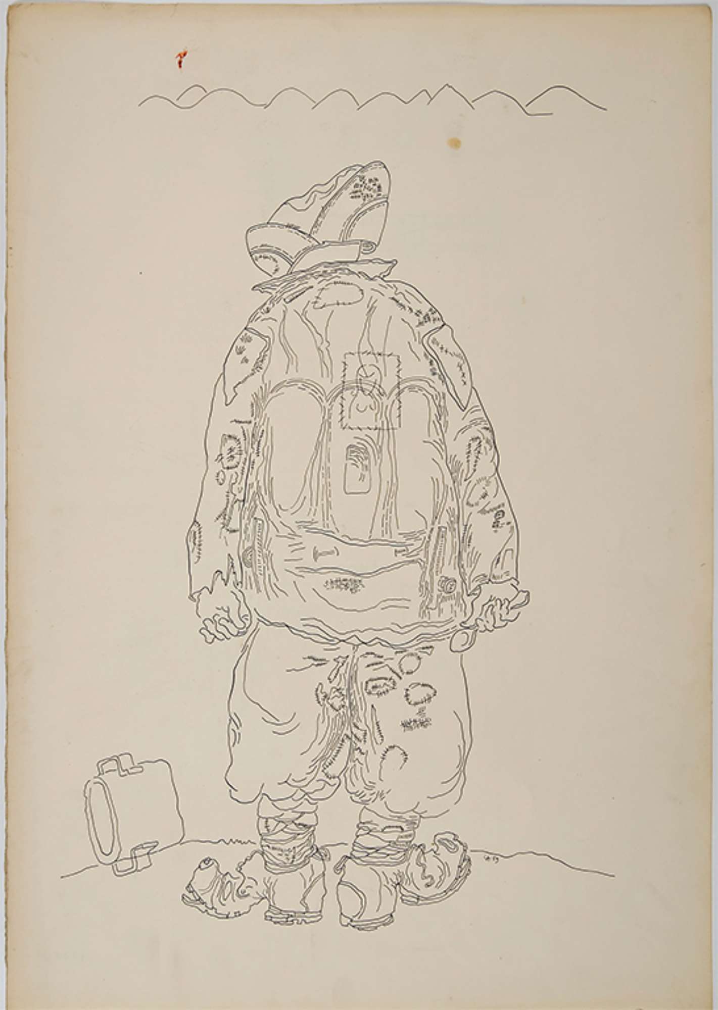 Sullo sfondo completamente bianco della carta, si staglia la sagoma di un soldato rappresentato di spalle, in piedi, con la testa chinata. Indossa un'uniforme logora e spiegazzata, rammendata con pezze di varia grandezza in numerosi punti, probabilmente a significare le ferite intime e psicologiche della guerra. In mano ha un cucchiaio, mentre a terra di fianco a lui c'è una gamella per il rancio vuota e rovesciata, ad indicare la condizione misera a cui la guerra inevitabilmente conduce il genere umano.