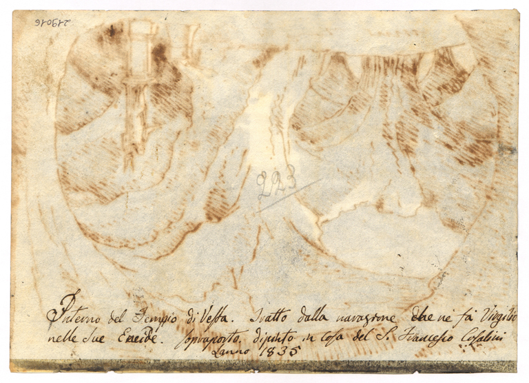 Il disegno appartiene ad un album sciolto, composto da 228 tavole di cm. 22 x 15,5, con disegni a penna acquarellati in grigio; poiché alcune tavole comprendono diversi soggetti, i disegni sommano in totale a 275. I soggetti sono di genere teatrale, sia specificamente per melodrammi e commedie, sia per scene di genere: alcuni sono tratti da stampe ma finalizzati all'esercitazione su un repertorio di immagini e fonti per soggetti teatrali. Si fa eccezione per alcuni precisi nuclei di vedute: Recanati e dintorni (n. 2-9; 59-64), Brisighella (n. 72-94), Castel Bolognese e dintorni (n. 94-104). Le note di Liverani si riferiscono all'utilizzo di alcuni disegni per lavori realizzati tra il 1838 e il 1843.