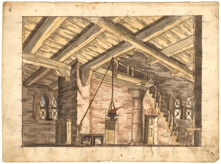 L'iscrizione relativa a questo disegno lo definisce come camera rustica di un'osteria dipinta nell'opera di Gioacchino Rossini L'occasione fa il ladro o Il cambio della valigia, eseguita a Faenza in occasione della stagione di carnevale del 1824. Reca la quadrettatura a matita.