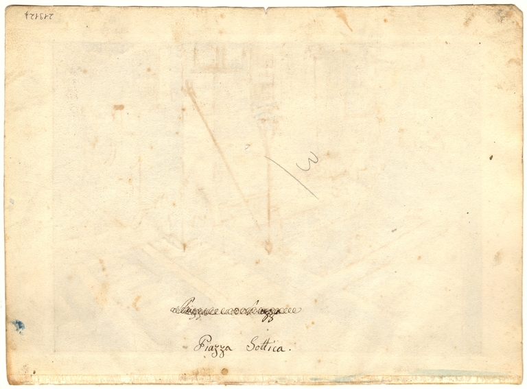 Il disegno appartiene all'album sciolto n. 5. Esso contiene disegni a penna acquarellati non sempre d'invenzione, ma studi da stampe di altri scenografi: Angelo Belloni, Pietro Piani, Antonio Basoli, Francesco Fontanesi, Clemente Caldesi, Pelagalli, oltre a bozzetti per prospettive dipinte. L'iscrizione sul verso si riferisce alla tavola successiva.