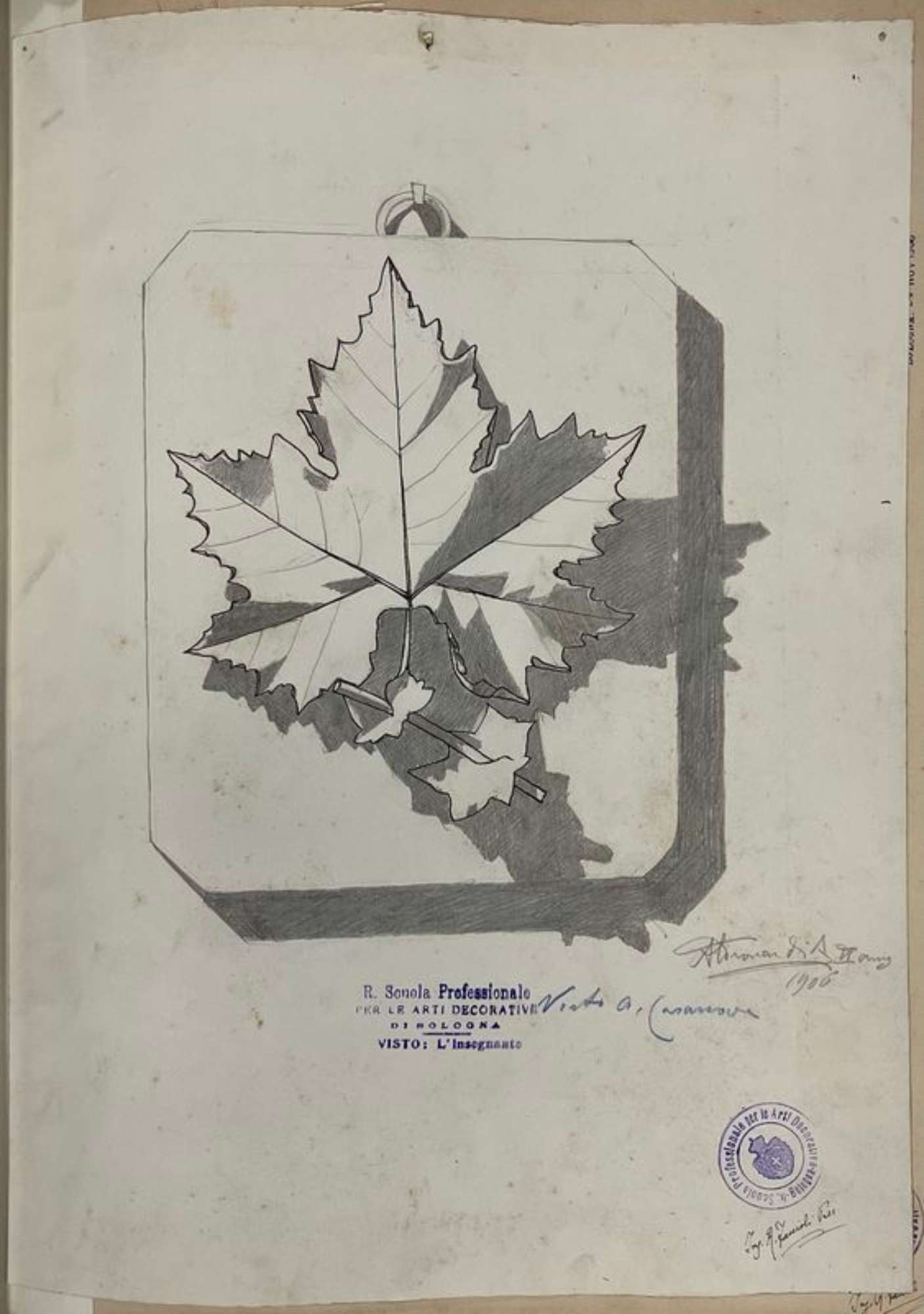 Questo disegno è stato eseguito negli anni in cui presso la Regia Scuola Professionale per le Arti Decorative ha insegnato Disegno ornamentale l'artista Achille Casanova (1889-1909). La scuola venne fondata nel 1885, per iniziativa di alcuni soci del Circolo Artistico bolognese e con l'appoggio e i finanziamenti di Comune, Provincia e Camera di Commercio.