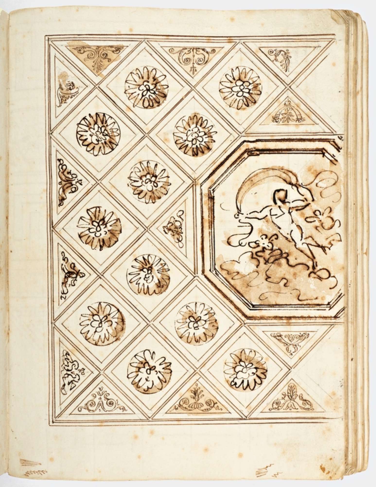 Studio di soffitto a riquadri con elementi figurativi e di ornato.