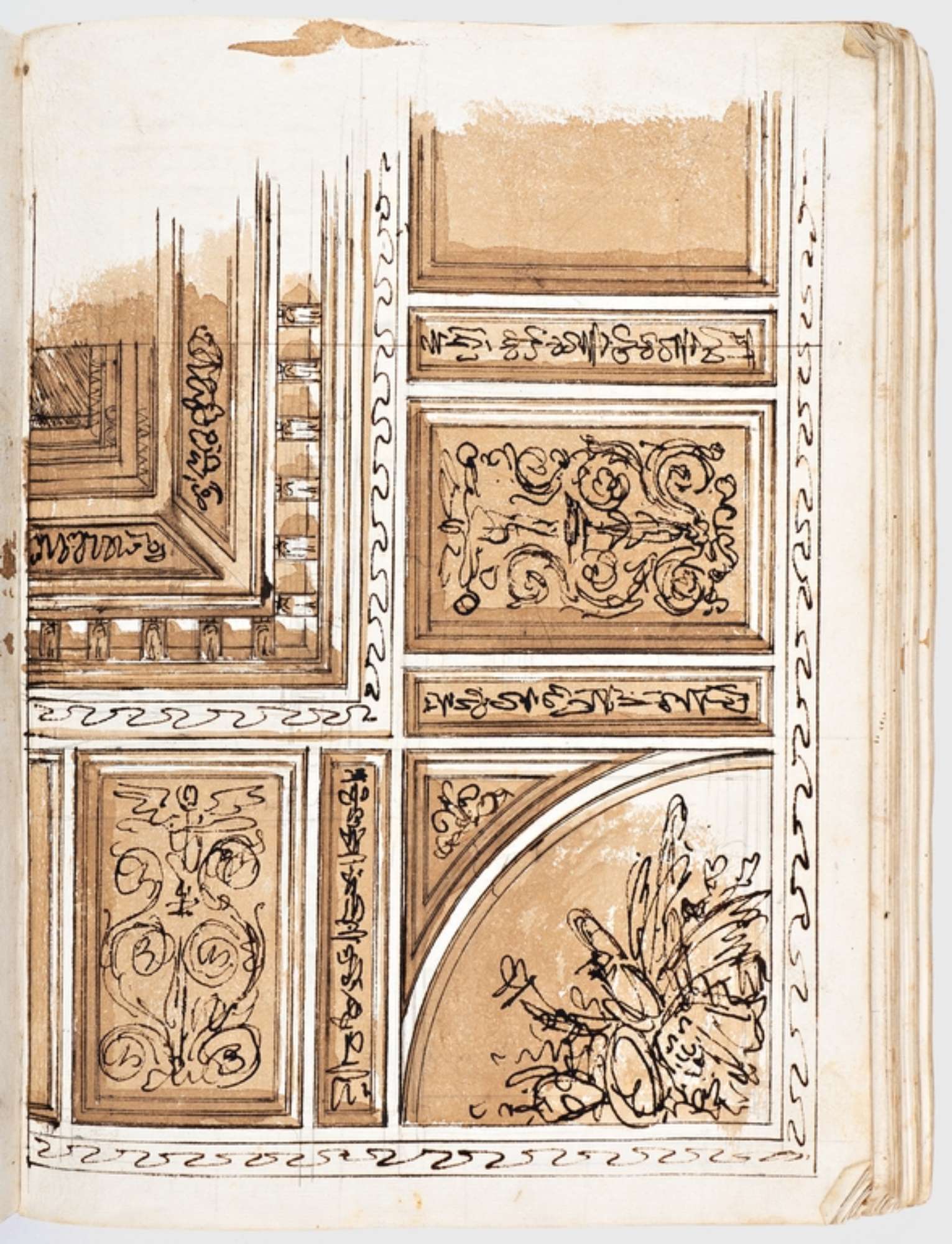 Studio di soffitto con partiture decorative geometriche, elementi di prospettiva illusionistica e decorazione a grottesche. Acquerellatura bruna.