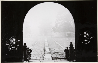 Veduta di una tomba imperiale immersa nella nebbia. Le fa da cornice la volta a tutto sesto sotto cui è avvenuto lo scatto. Sulla destra è visibile anche un grosso pino.