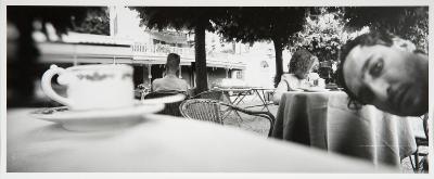 Nell'immagine sono inquadrati tre tavolini tondi di un bar in un esterno. Su quello in primo piano è posata una tazzina da caffè bianca con dei dettagli, sfocata. Sulla destra è affacciato un uomo che guarda nell'obiettivo. Due altre persone siedono ai tavoli in secondo piano. Sullo sfondo dei palazzi di città, un'automobile e degli alberi.