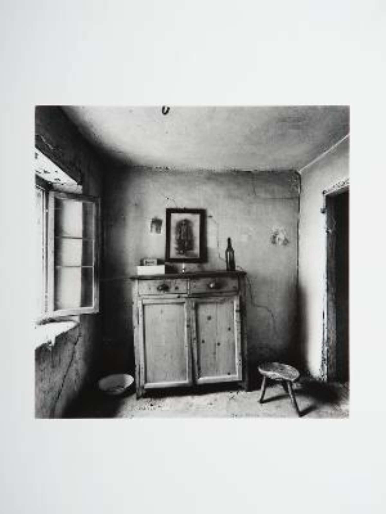 Nell'immagine è ripresa una porzione di stanza all'interno di un appartamento. Sulla sinistra una finestra aperta fa entrare la luce. Al centro un mobiletto in legno a due ante su cui sono poggiati alcuni oggetti: da sinistra a destra due scatole sovrapposte, una candela e una bottiglia in vetro. Sulla parete di fondo, al centro, è appeso il ritratto di un uomo a figura intera, mentre sulla sinistra una piccola immagine. Accanto al mobile vi sono, sulla sinistra, un largo recipiente e, sulla destra, un piccolo sgabello a tre gambe. La stanza è collegata, poi, a destra, con un altro ambiente.