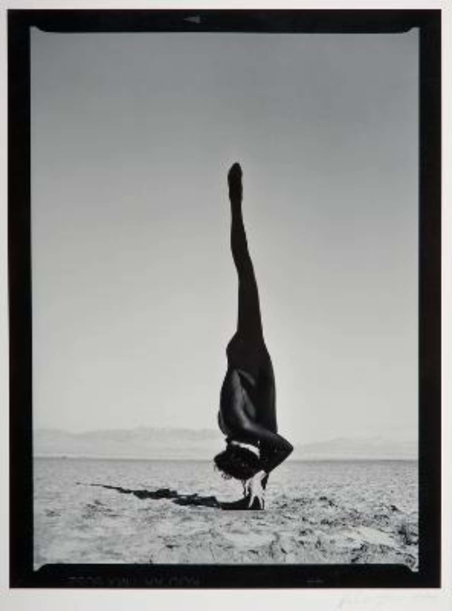 In un paesaggio esterno deserto, al centro ed in primo piano, una donna vestita interamente di nero fa una spaccata verticale tenendosi la gamba destra con le mani. La sua ombra è proiettata verso sinistra. Sullo sfondo alcune montagne.