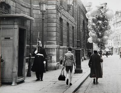 Un venditore di palloncini cammina, di spalle, lungo rue du Faubourg-St.-Honoré, a Parigi. Di fianco, frontalmente, un uomo fa da guardia a Palazzo Elysée. Al centro della foto cammina, sempre di spalle, un altra persona che regge in mano una borsa scura. Sul fondo un gruppo di donne attraversa la strada mentre un auto è in corsa da destra verso sinistra.