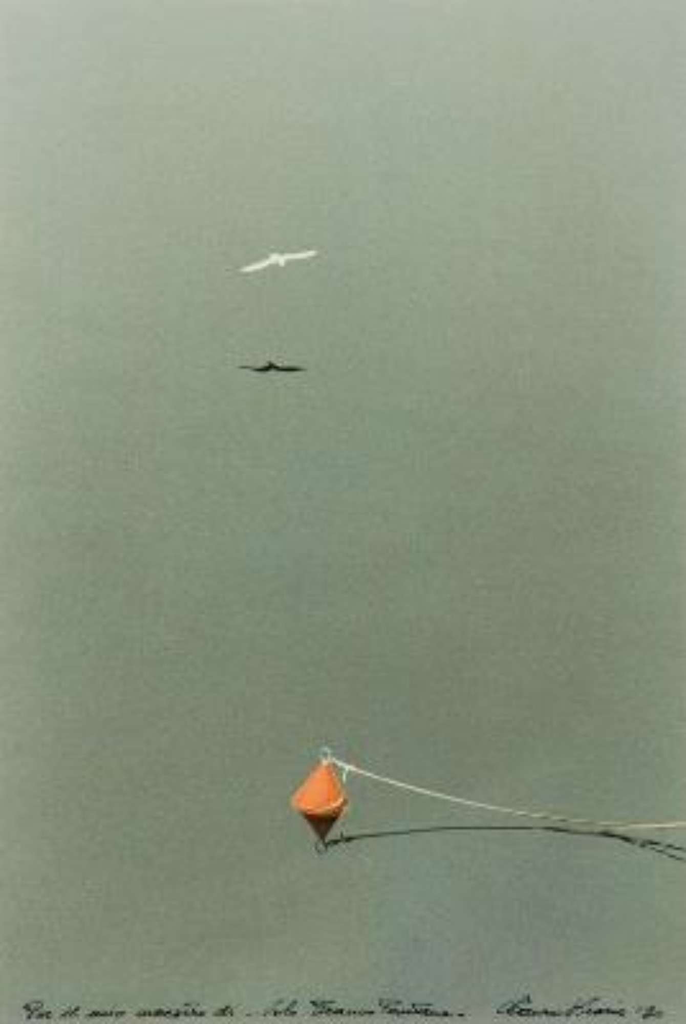 Nella foto, in primo piano sulla destra, una boa rossa in pieno mare. Plana, dall'alto e da sinistra un gabbiano, che proietta la sua ombra sullo specchio dell'acqua.