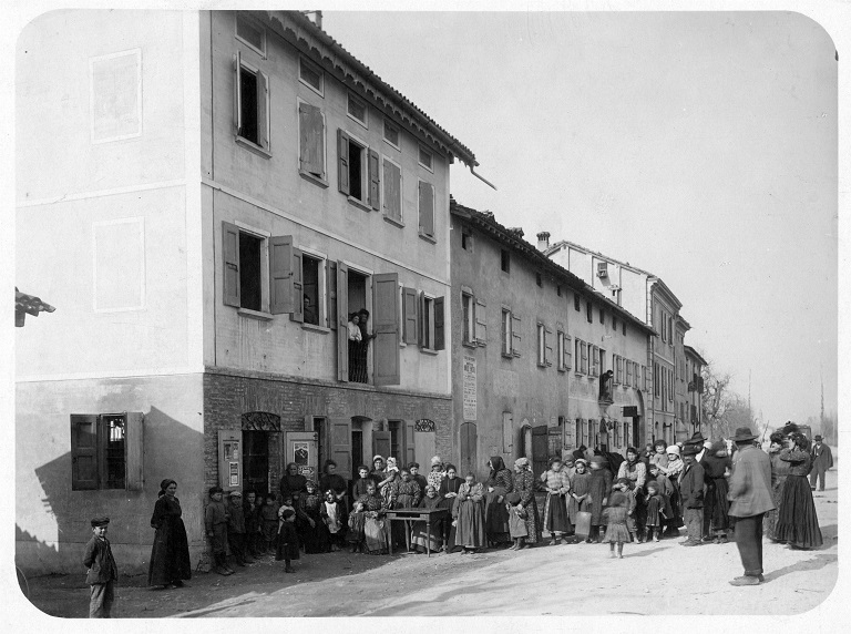 La fotografia fa parte di una raccolta di 12 immagini di case popolari e dei loro abitanti. Si tratta probabilmente delle case del “Villaggio dei Pazzi”, cioè del quartiere circostante al San Lazzaro nelle quali erano collocate le ammalate che venivano affidate ad alcune famiglie di contadini (spesso infermieri o ex infermieri). Data l’attenzione alla disposizione delle persone e all'inquadratura, lo scopo di queste fotografie era probabilmente documentario/espositivo.