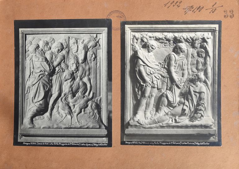 Positivo incollato su cartoncino spesso di colore marrone. Assieme ad esso è assemblato un altro positivo della Fotografia dell'Emilia raffigurante L'arca di Noè, bassorilievo della Porta Magna di S.Petronio di Bologna. Il negativo, numerato 5126, è anch'esso presente nel catalogo Poppi del 1888.