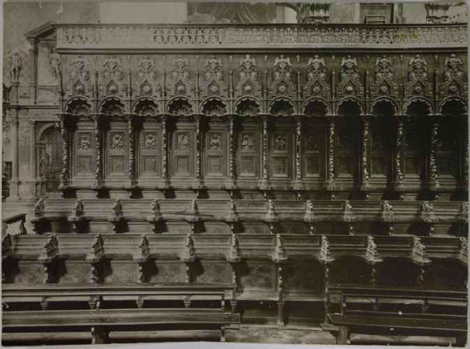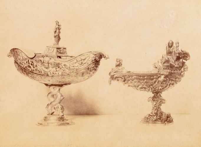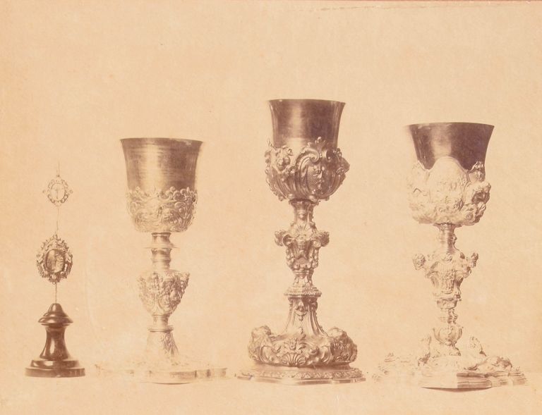 Positivo incollato su cartoncino spesso di colore marrone. Assieme ad esso è assemblato un altro positivo raffigurante due navicelle porta incenso; scattate in occasione della Mostra di Arte Sacra tenutasi a Bologna nel 1900; entrambe le opere, da un'analisi storica e bibliografica, possono essere attribuite a Pietro Poppi.