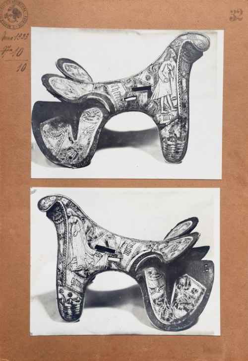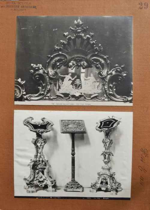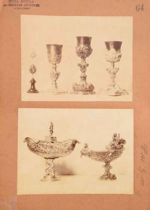 La fotografia fa parte del fondo di ca. 200 positivi rinvenuto nella biblioteca dell'Istituto Statale d'Arte di Bologna nell'anno 1999. Le foto, positivi bn in parte assemblati (incollati a coppie o a tre o più esemplari su cartoncini con didascalia manoscritta), costituivano il materiale didattico utilizzato per le esercitazioni di disegno e ornato e per lo studio della storia dell'arte. Documentavano, inoltre, la produzione interna di manufatti in gesso o in ferro battuto oppure le gite di studio – per esempio a Ferrara a vedere gli affreschi di Schifanoia. Autore della gran parte delle fotografie è Pietro Poppi (e succ. Fotografia dell'Emilia) ma molte, soprattutto quelle di documentazione degli oggetti prodotti dagli studenti, venivano scattate all'interno del Laboratorio Fotografico dell'Istituto medesimo. Nel corso dell'anno 2000 è stato avviato, in collaborazione con la SPSAD BO, un progetto di catalogazione e restauro di ca. 100 esemplari