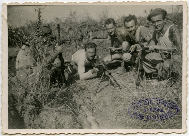 Partigiani del Distaccamento di valle "Terzo Lori" della 28a Brigata GAP "Mario Gordini" ritratti in uno dei camminamenti scavati all'Isola degli Spinaroni nella Pialassa della Baiona (Porto Corsini, Ravenna). Il terzo partigiano da destra è Vernocchi Delio detto Blok