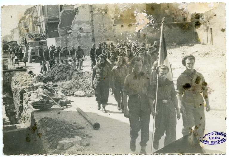 Il trasporto delle salme e i funerali dei partigiani Mario Gordini e Settimio Garavini svoltisi a Ravenna il 28 maggio 1945. In prima fila a destra è stato riconosciuto il partigiano Lino Bondi.