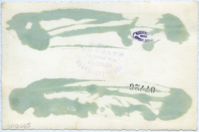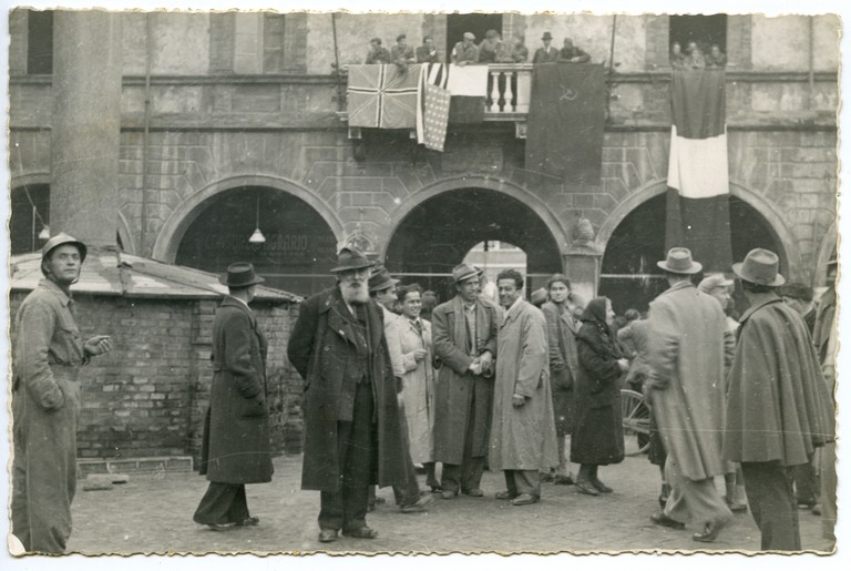 Liberazione di Ravenna. Veduta di Piazza del Popolo verso il balcone del Palazzo Comunale addobbato con le bandiere alleate e a sinistra la colonna veneziana ricoperta con la protezione antiaerea.