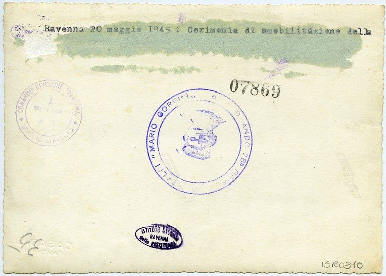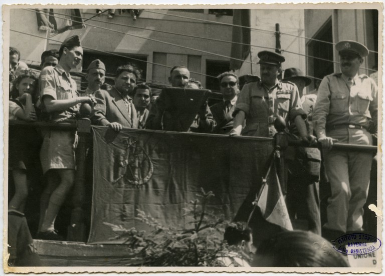 Smobilitazione della 28a Brigata Garibaldi "Mario Gordini" il 20 maggio 1945. Arrigo Boldrini "Bulow" parla dal palco allestito in Piazza del Mercato (attuale Piazza Kennedy), dinanzi alla Casa del Mutilato. Alla sua destra Gaetano Verdelli (segretario della Federazione Comunista di Ravenna), dietro Verdelli il Generale Clemente Primieri (comandante del Gruppo di Combattimento "Cremona"), a sinistra di "Bulow" il Luogotenente Generale Charles Keightley (comandante del V Corpo dell'VIII Armata).