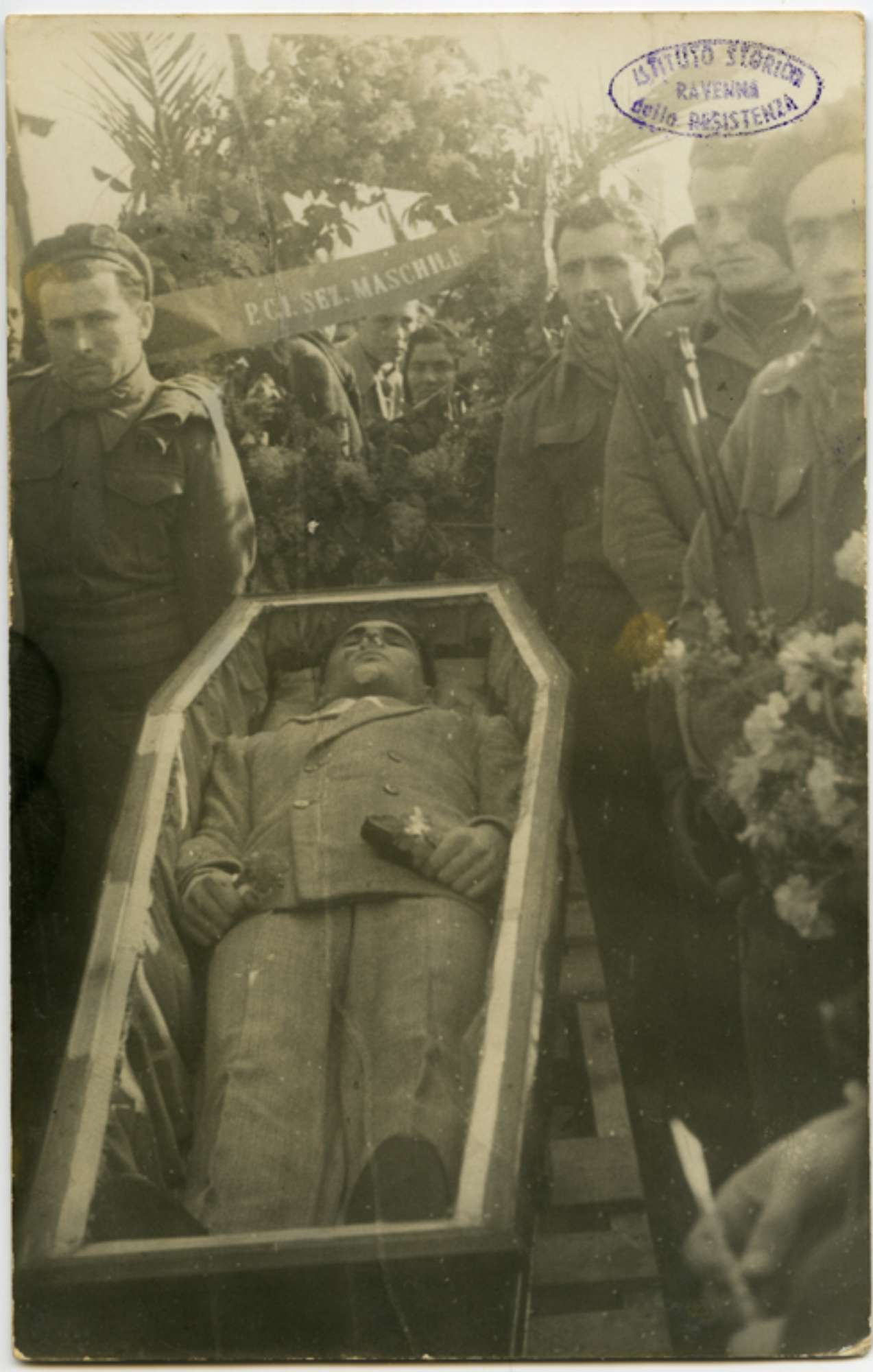 Il corpo di un partigiano caduto (Tani Leo?) esposto nella bara durante il funerale. Attorno alla cassa ci sono partigiani della 28a Brigata Garibaldi "Mario Gordini" in divisa e sul retro una corona funebre con la scritta "P.C.I. Sez. Maschile". La località potrebbe essere Lugo.