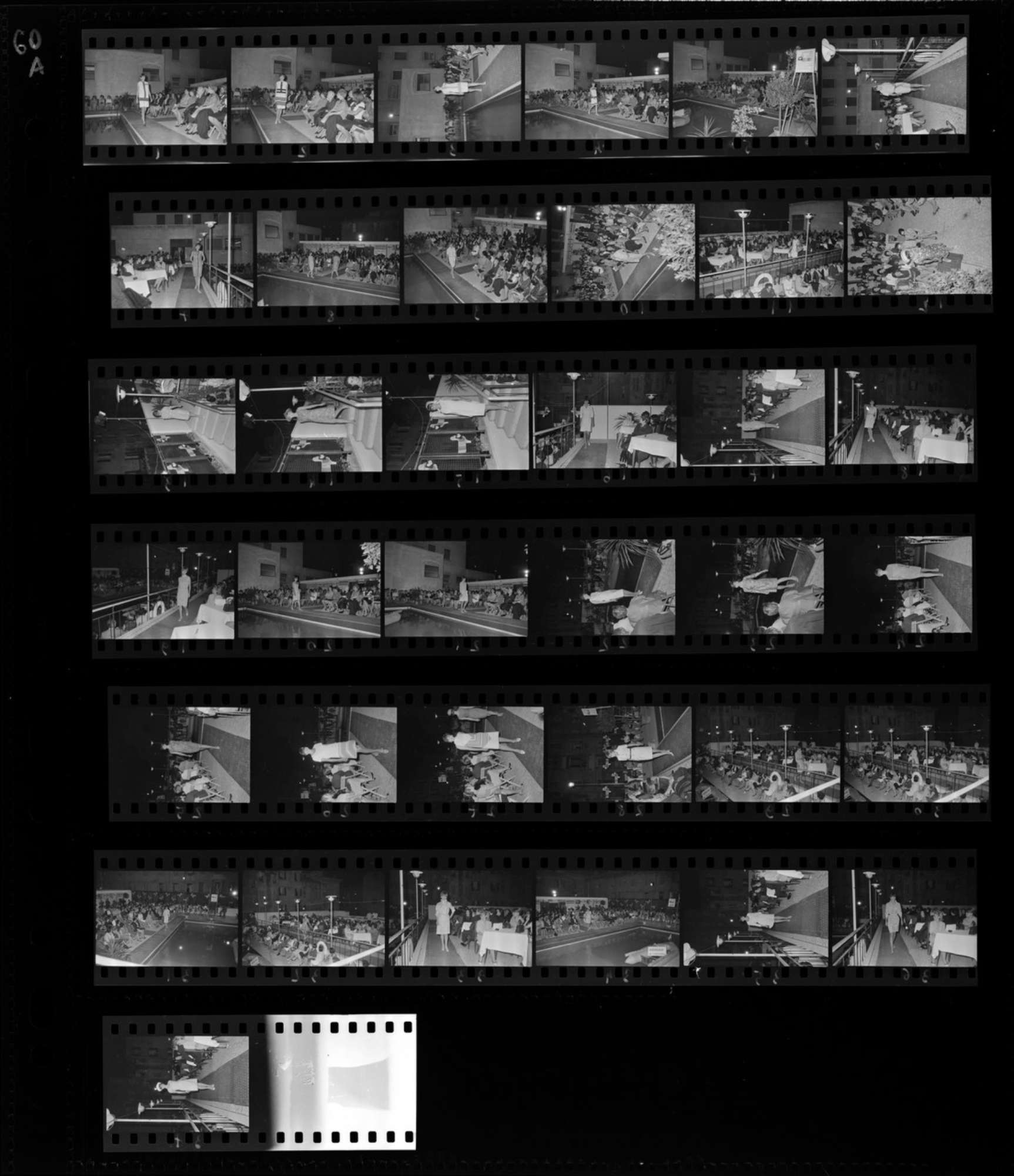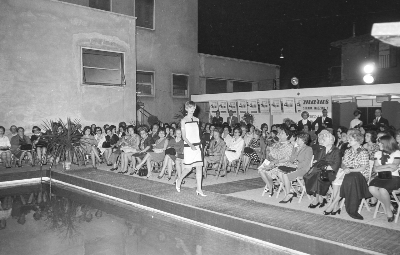 Vari servizi dell’archivio Montacchini documentano sfilate di moda legate al marchio MARUS (acronimo di Magazzini Abbigliamento Ragazzo Uomo Signora). L’azienda nasce nel 1938 a Torino, come prima catena di abbigliamento a livello nazionale. All’inizio degli anni Sessanta vengono periodicamente organizzate sfilate per attirare pubblico e per pubblicizzare le nuove collezioni e alla fine del decennio la catena conta 19 punti vendita nelle maggiori città italiane. A Parma il negozio ha sede in Strada Mazzini 1 e le sfilate si svolgono all’aperto o al chiuso probabilmente appoggiandosi all’Hotel Jolly, come da nota manoscritta, nel suo ampio salone adatto ad eventi pubblici di questo tipo.