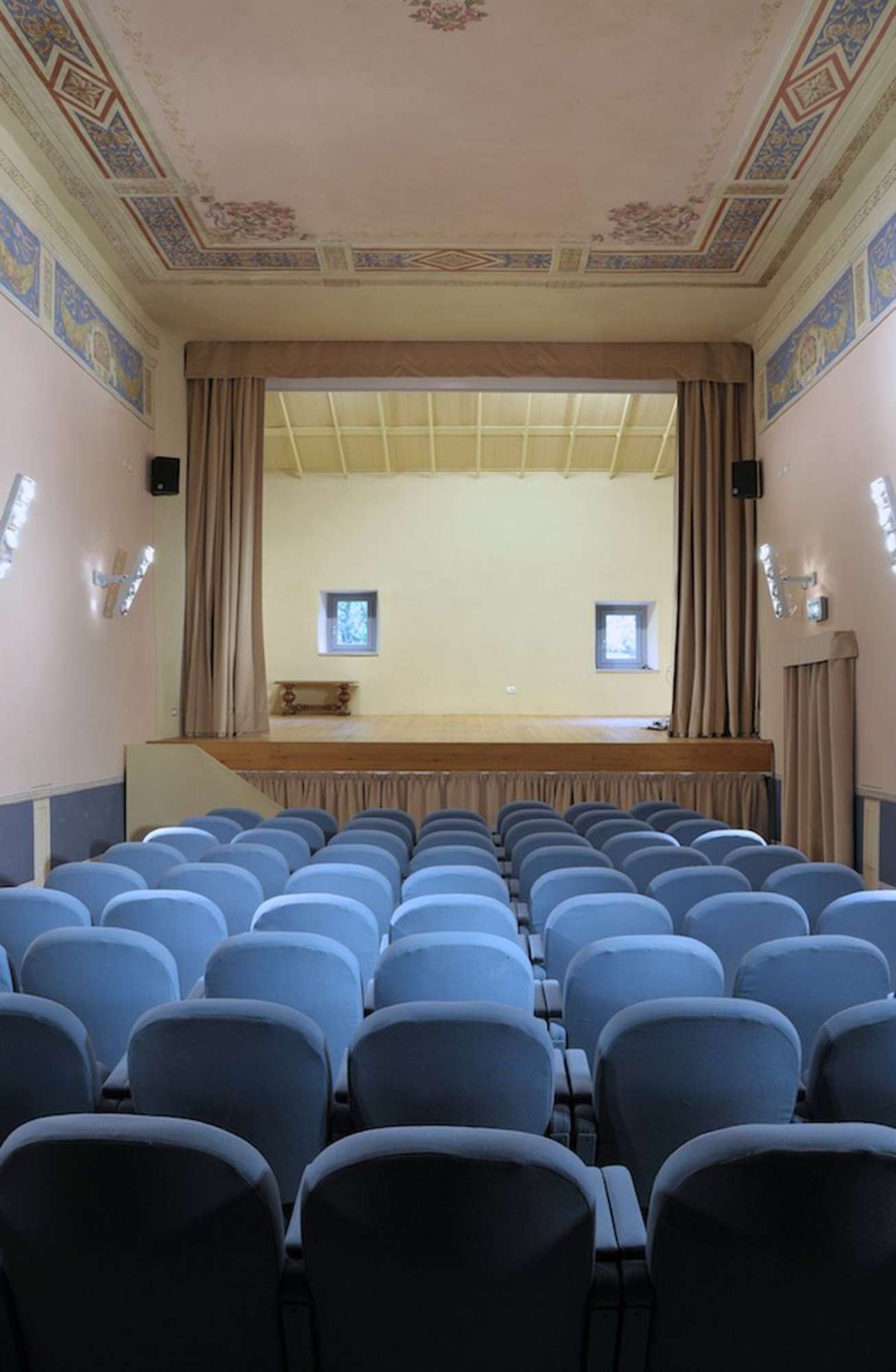 Questo piccolo teatro, posto all’interno della Residenza Comunale, consta di una sala a pianta rettangolare con balconata. L’edificio è parte di un complesso architettonico assai articolato che in passato ospitò il Monastero delle Domenicane di Santa Caterina da Siena, fondato nel 1579 per volontà della comunità fiumalbina. Il monastero venne formalmente soppresso a seguito del Decreto napoleonico dell’8 giugno 1805. Nel tempo la struttura originale ha subito modifiche dovute principalmente all’insediamento della sede municipale, tuttavia ne è stata preservata la volumetria e forse la stessa articolazione spaziale. Muri perimetrali e vani ampi, compreso il sistema delle volte al piano terra, parrebbero essere rimasti i medesimi dal XVI secolo.