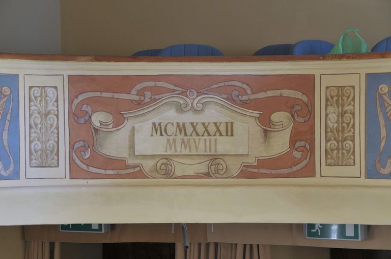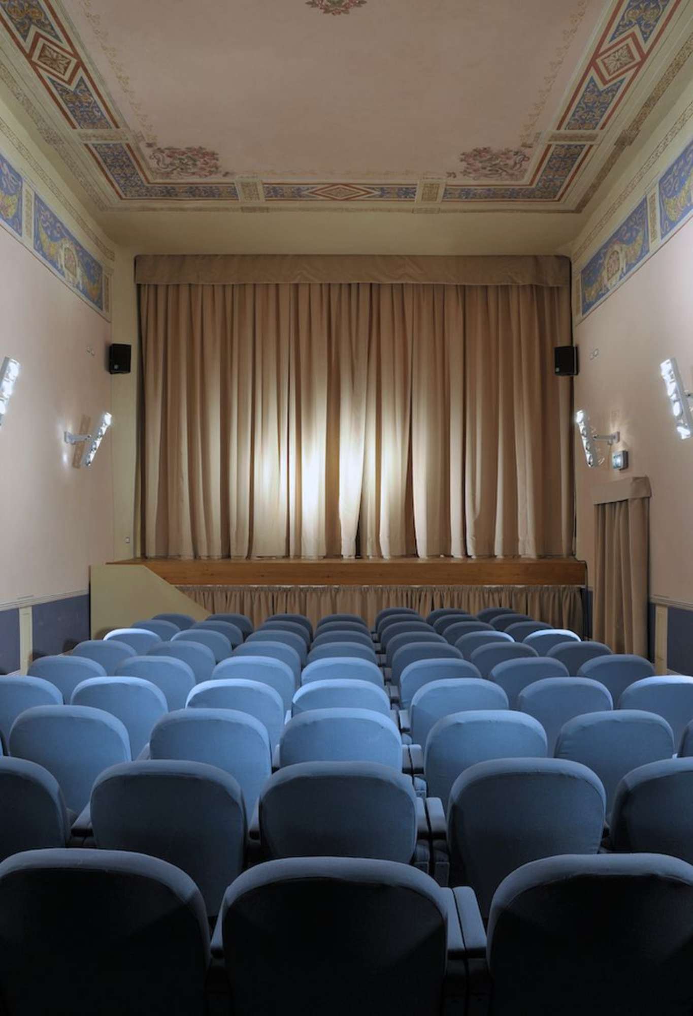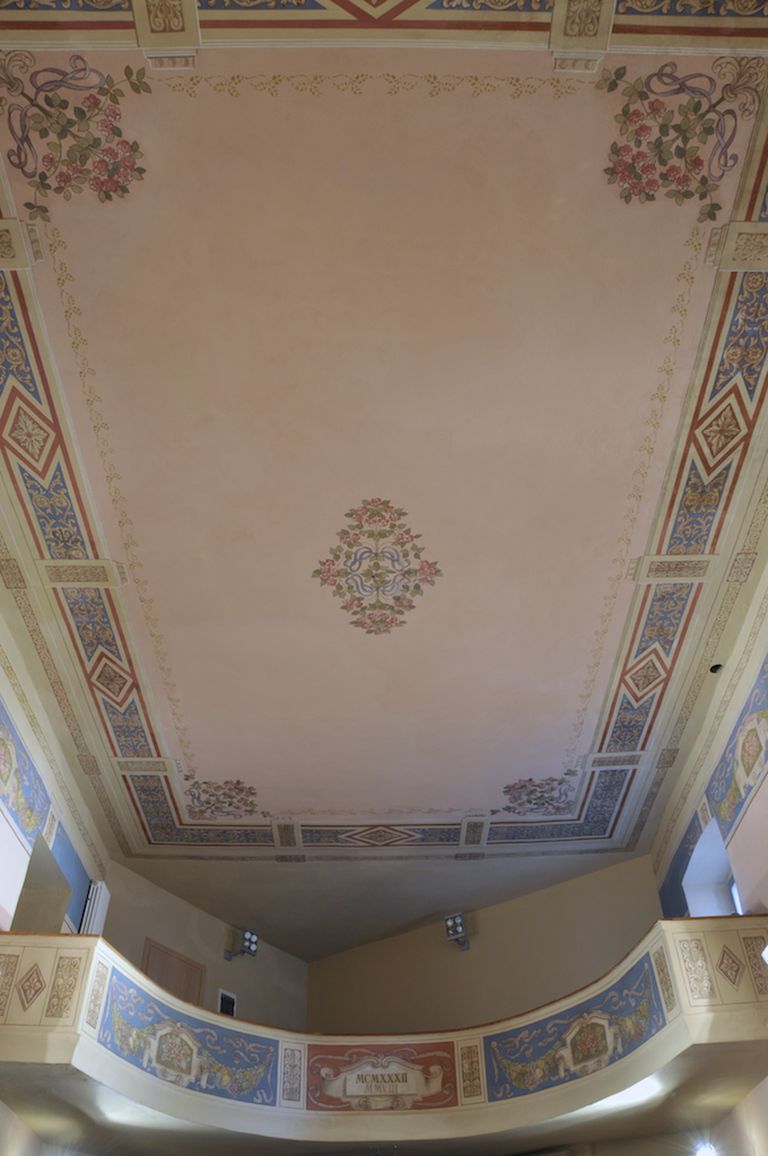 Il teatrino, semplice ed elegante, è predisposto per una settantina di spettatori che trovano posto nella sola platea mentre la balconata, anch’essa di contenute dimensioni, chiude un inconsueto angolo opposto al palcoscenico. Il soffitto presenta una decorazione che ne circoscrive l’intero perimetro con al centro un decoro floreale, mentre due larghe fasce pittoriche a specchiature con festoni, nastri e cartigli su campo azzurro, ornano i sottostanti i lati lunghi. Decorazioni queste riproposte anche sulla balconata ove affiancano il cartiglio centrale su cui è riportata la data 1932 in numeri romani, il tutto in gusto tardo Liberty.(Lidia Bortolotti)