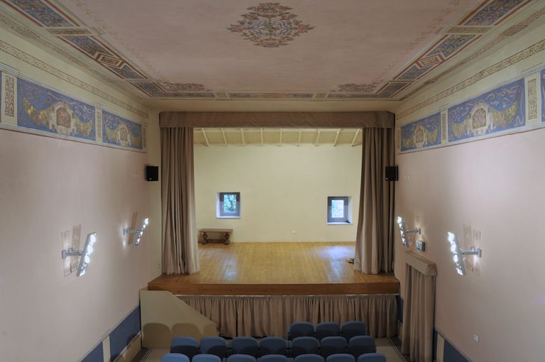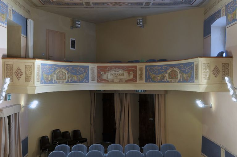 Dalla documentazione reperita, dagli architetti che ne hanno curato il restauro, risulta che un ampio locale identificato con il “refettorio vecchio” dell’antico monastero, dapprima utilizzato come sala comunale, venne successivamente adattato ad uso di teatro. La trasformazione pare abbia avuto luogo ai primi del Novecento, tuttavia una lettera datata 5 maggio 1865 confermerebbe che nel corso di alcuni lavori di sistemazione, realizzati all’interno della casa comunale, era già stato previsto questo adattamento. Inoltre un inventario più antico, probabilmente della fine del ‘700, proverebbe inequivocabilmente la presenza di un teatro già in quell’epoca. Vi si annota infatti la presenza di elementi necessari alla funzionalità teatrale, ossia “[…] lumini di latta ad uso del teatro […] uno scenario di legno con suo sipario e varie scene formate sul palco […] quadro sopra il teatro con l’arma del Comune […] un legno lungo ad uso del scenario”. La significativa testimonianza si riferirebbe ad un diverso locale adibito ad uso di teatro la cui localizzazione tuttavia non è stata ancora individuata.