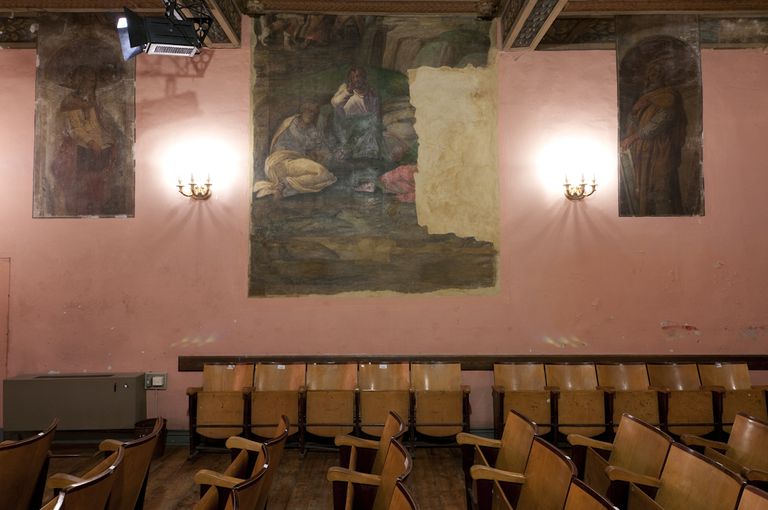 Bologna, Teatro di San Salvatore, la sala: particolare del lacerto di affresco parietale dell'antica sala del Capitolo, Gesù nell'orto con gli apostoli, opera di Biagio Pupini detto delle Lame (Foto di Andrea Scardova, IBC) 2014