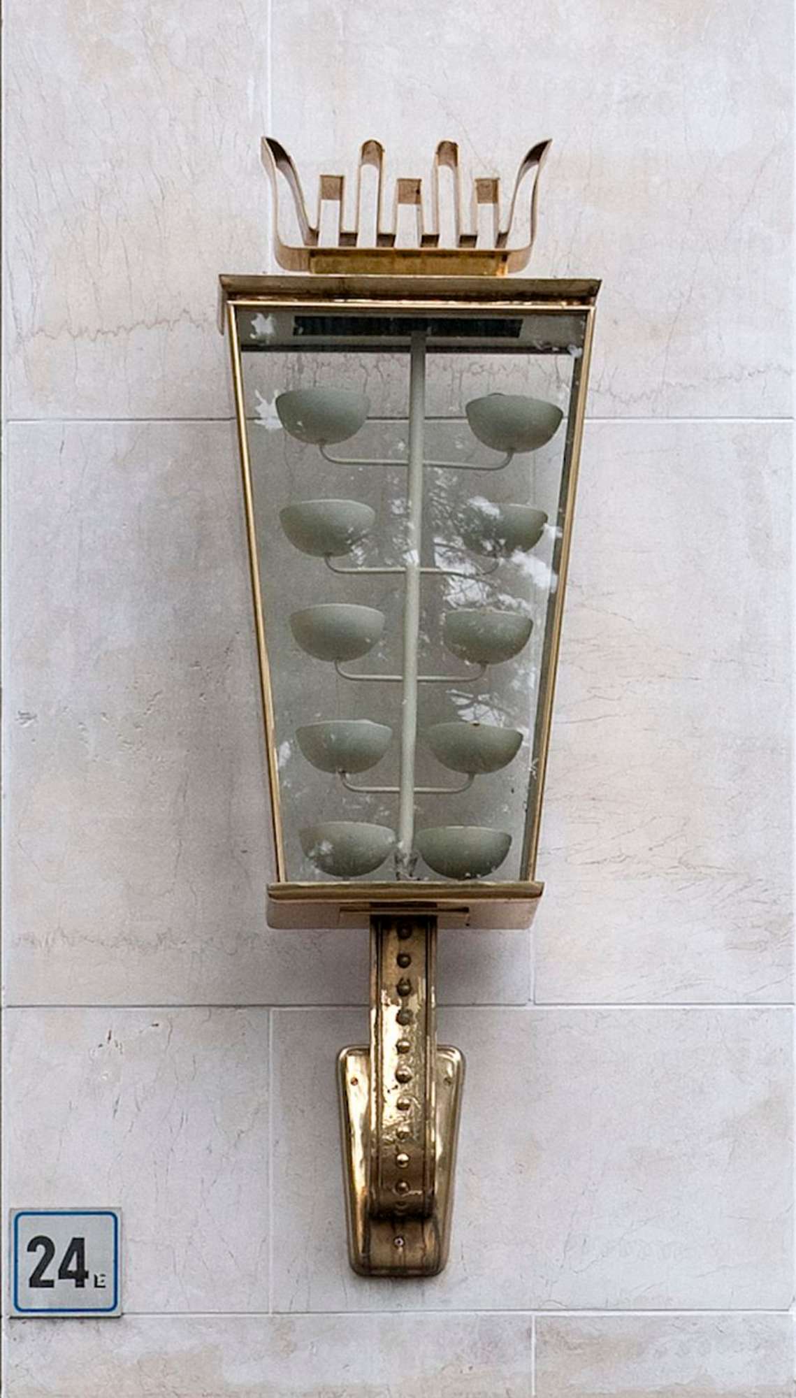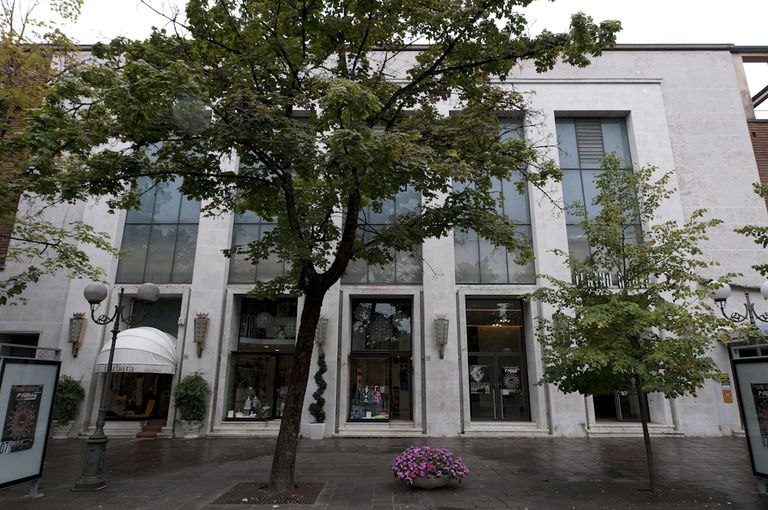 L’esterno si contraddistingue per le linee squadrate tipiche dello stile razionalista, i prospetti sono rivestiti da paramenti in marmo e cotto con serie ordinate di finestre incorniciate. La facciata è connotata da un avancorpo rivestito in marmo che incornicia le cinque aperture originali (di cui attualmente solo due sono funzionali al teatro), sormontate da ampi finestroni, eleganti lampioni pensili d’epoca sono tuttora in loco.