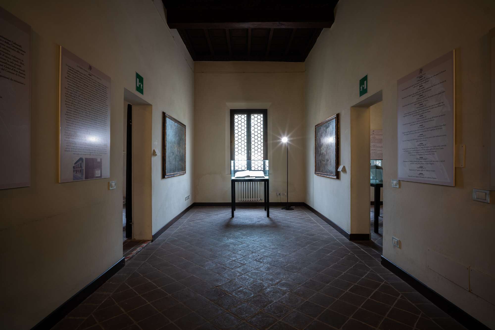 L’edificio fu acquistato da Ludovico Ariosto tra la primavera e l’estate del 1526, al termine del suo incarico come governatore della Garfagnana. Due anni dopo la proprietà fu ampliata con un terreno confinante, esteso verso la chiesa vecchia di San Benedetto. Il complesso era collocato in contrada Mirasole, zona abitata soprattutto da funzionari e dipendenti della corte, all’interno dell’Addizione Erculea, il grande progetto urbanistico avviato da Ercole I d’Este. Nel ristrutturare la casa Ariosto si era ispirato alla tradizione edilizia ferrarese, reinterpretandola con soluzioni inedite sia nella distribuzione interna che nell’aspetto esterno. Il risultato è una dimora ad impianto quadrato le cui caratteristiche riflettevano un equilibrio architettonico nuovo rispetto ai modelli contemporanei e che non avevano precedenti nel panorama cittadino. Innovativa, in particolare, è la disposizione dei camini sul lato opposto rispetto al fronte strada, così come orginale è lo spazio riservato all’ampia sala che occupa gran parte del piano superiore. Sulla facciata inoltre Ariosto ha voluto mantenere l’iscrizione preesistente: «Parva, sed apta mihi, sed nulli obnoxia, sed non / sordida, parta meo, sed tamen aere domus», (la casa è piccola ma adatta a me, pulita, non gravata da canoni e acquistata solo con il mio denaro). Oggi le sale al piano nobile di questa “piccola casa” propongono una ricostruzione storico-evocativa dell’allestimento realizzato in occasione delle Celebrazioni per i Centenari Ariosteschi del 1875 e del 1933, attraverso cimeli e pregevoli edizioni delle opere del poeta.