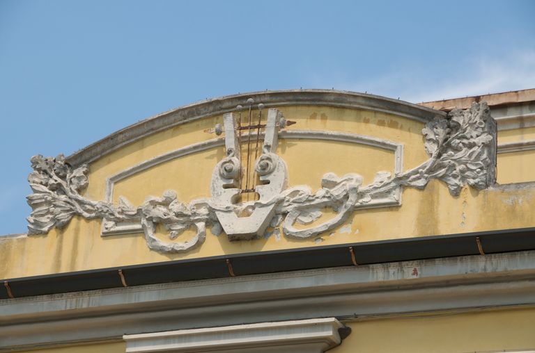Finale Emilia, Teatro Sociale, esterno, particolare della cimasa posta sui due avancorpi laterali (foto Andrea Scardova, IBC)
