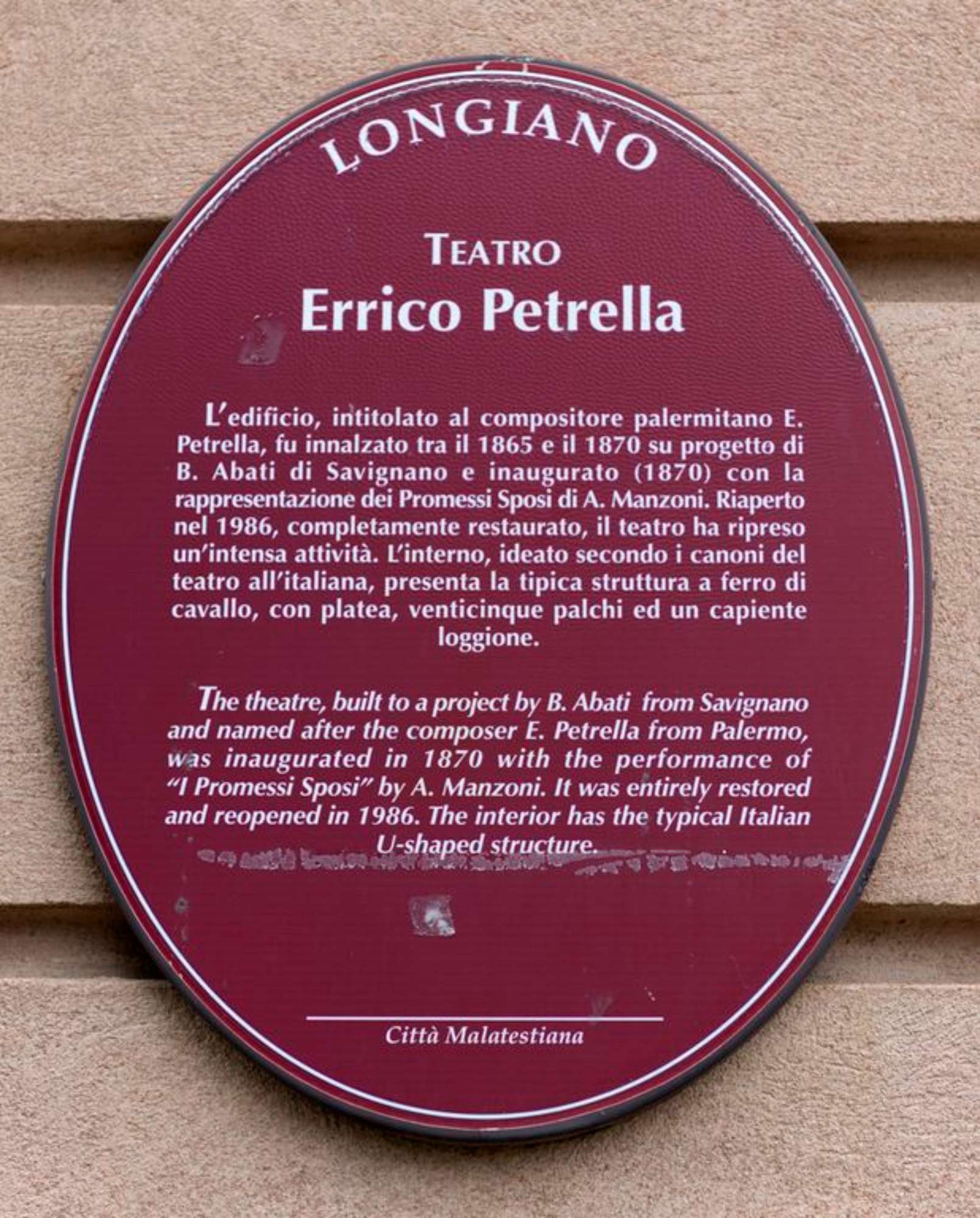 Longiano, Teatro Comunale Errico Petrella, esterno: cartiglio descrittivo (foto Andrea Scardova, IBC) 2017