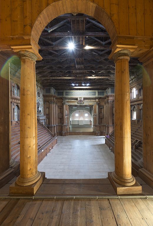 Date le sue enormi dimensioni, la sala venne utilizzata ben poche volte (dopo il 1689 le si preferiva il piccolo teatro adiacente, costruito allora da Stefano Lolli), di cui l'ultima fu nel 1732; cadde poi in un totale abbandono e nel 1944 fu quasi interamente distrutta da un'incursione aerea. Restaurata a partire dal 1952 (ma la copertura era già stata fatta nel 1945) è stata ricostruita in legno come in originale. Vi si accede tramite l'ampio e scenografico scalone del Moschino che conduce ad un atrio in cui un portale imponente, decorato con le armi farnesiane e inquadrato da colonne corinzie, ne denuncia l'ingresso costituito da una stretto corridoio che immette direttamente nell'invaso teatrale. Qui è una cavea delimitata da balaustri e formata da tredici gradoni sui quali s'imposta il primo ordine dorico di serliane cui si sovrappone il secondo ionico terminante con una ringhiera in origine sormontata da figurazioni plastiche. Le serliane delimitano due gallerie i cui muri e soffitti erano interamente decorati illusionisticamente, secondo una trama allegorica ormai illeggibile.