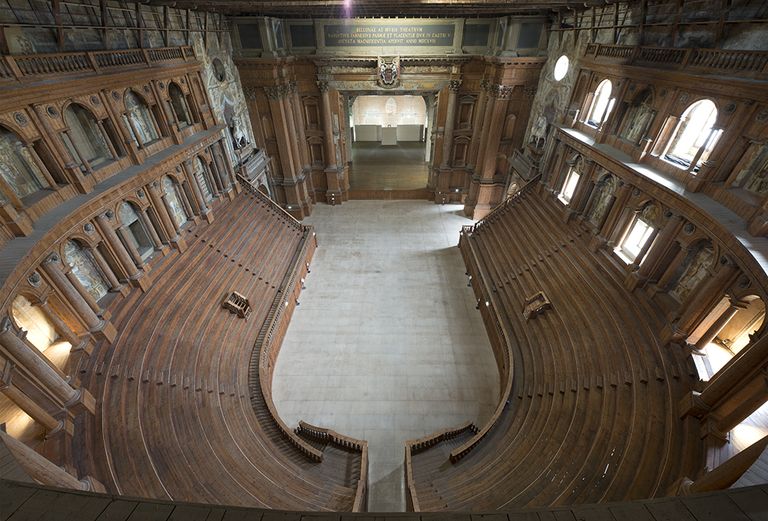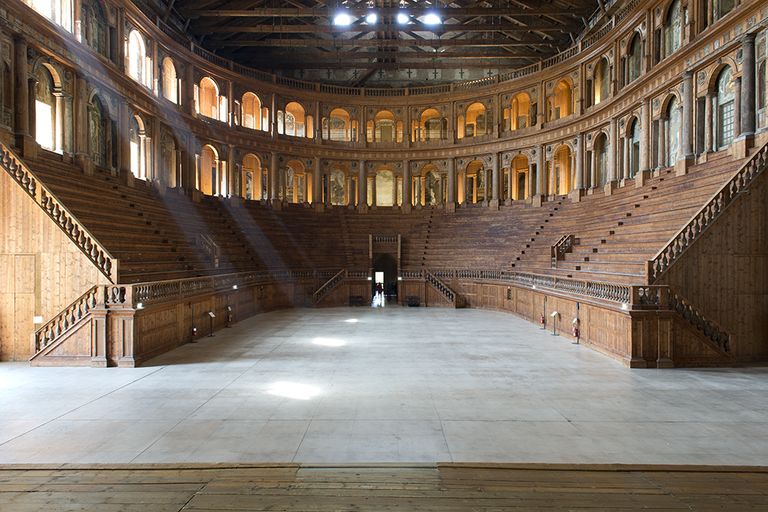 Le medesime ragioni politico-rappresentative avevano promosso dieci anni prima la grandiosa costruzione per la quale l'Aleotti, già esperto scenotecnico e architetto teatrale (suo era il Teatro degli Intrepidi di Ferrara) ideò un progetto che, pur traendo alimento dalle sperimentazioni del teatro classico, si realizzò in una soluzione tesa a divenire prototipo del teatro moderno e "momento fondamentale dell'evoluzione dei valori scenografici dell'architettura e della decorazione in Emilia" (D. Lenzi, I teatri, in AA.VV., L'arte del Settecento emiliano. Architettura, scenografia, pittura di paesaggio, catalogo della mostra, Alfa, Bologna 1980, p. 103) per la prodigiosa integrazione fra architettura, pittura e scultura che qualificava lo spazio con ardite finzioni prospettiche, raffinate quadrature, seducenti figurazioni pittoriche e plastiche.